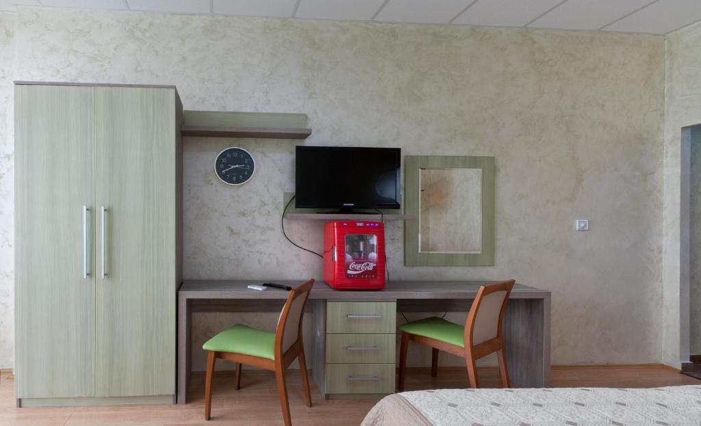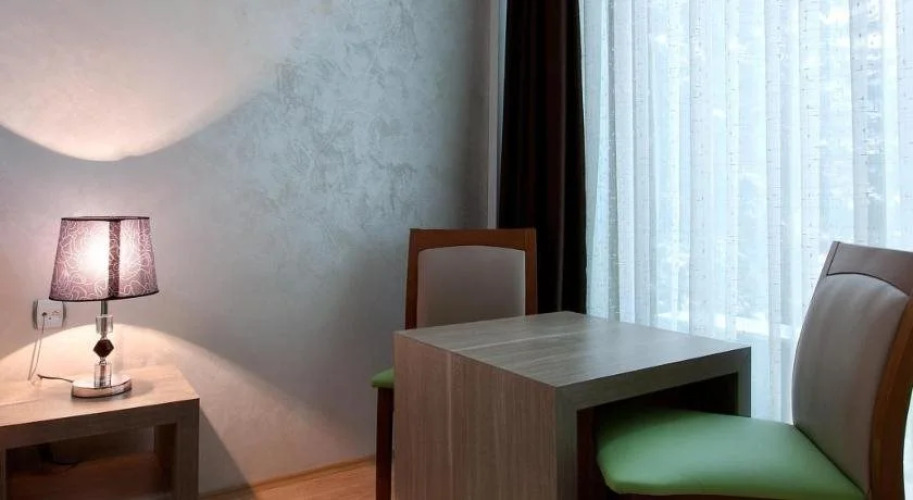 Номер уютно обставлен и оснащён необходимым, чтобы отдохнуть после долгого и насыщенного дня. Имеются будильник, телевизор, мини-бар, халат и тапочки. Оснащение зависит от выбранной категории номера.