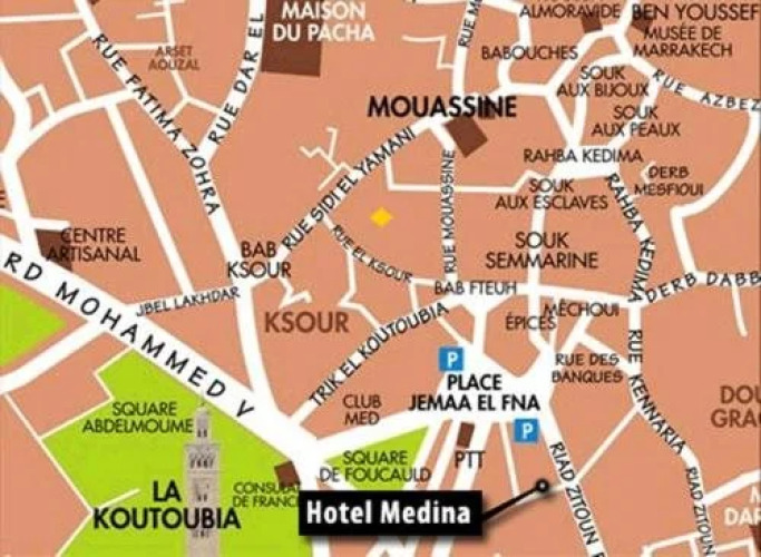Отель Medina 2 звезды, адрес на карте Марракеш, riad zitoun lkdim derb sidi bouloukat, с характеристиками номеров и возможностью онлайн бронирования на площадке vashotel.ru , стоимость проживания и удобства.
