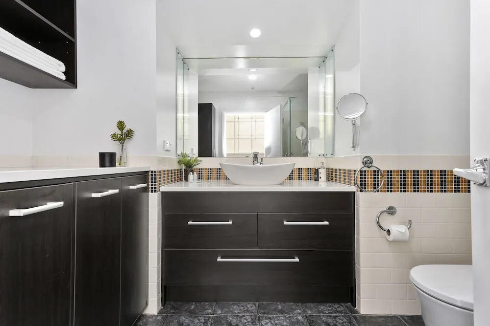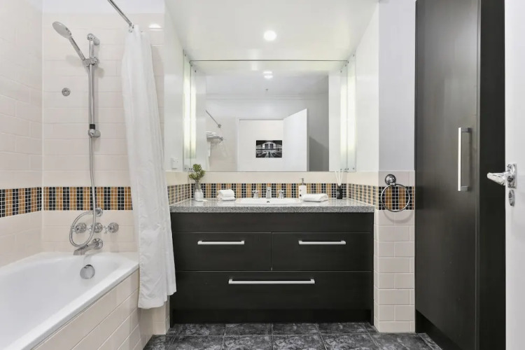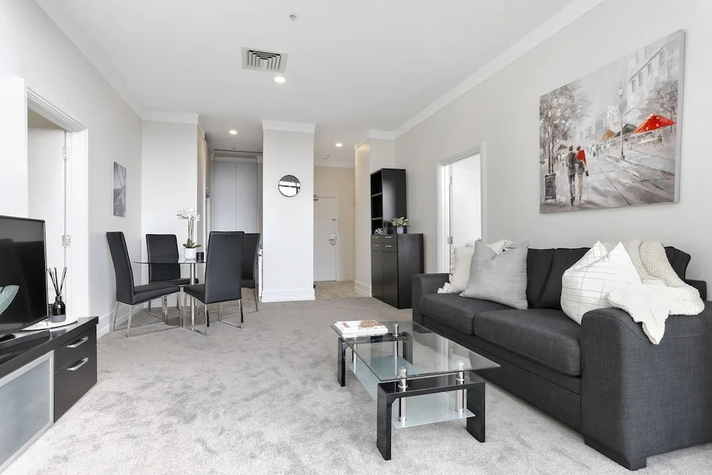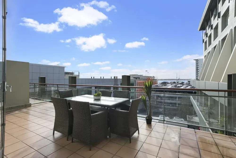 Отель Renovated Apt with huge deck & car park, адрес на карте Окленд, Apartment 438/35 Hobson Street, с описанием номеров и правом онлайн бронирования на ресурсе vashotel.ru , цены проживания и удобства.