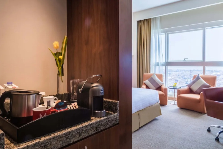 Applies for all Arrivals: Names/dates change is not allowed., Applies for all Arrivals: Children are not allowed to access the Club Lounge., Applies for all Arrivals: All guests receive complimentary shuttle to the Corniche Public Beach. Club Room privileges: Exclusive club lounge access. The option of International breakfast in the Lounge or International buffet breakfast at Al Wahda Lounge Restaurant. Tourist fees applicable should be paid upon arrival. Children share existing bedding – If you require an extra bed, this is subject to availability and additional charges will apply. Please contact Operations Team for assistance.