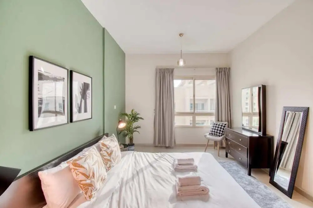 Отель Chic Ensuite Flat 10Min From Palm Jumeirah, адрес на карте Дубай, Al Ghozlan 1 - 4Th Street - Dubai - Unit Ed Arab Emirates, с описанием номеров и доступностью онлайн бронирования на площадке ВашОтель.RU , стоимость проживания и удобства.