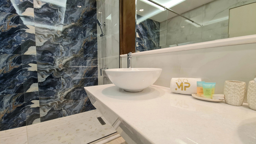 В главной спальне есть ванная комната с кроватью размера «king-size», приглушенным освещением, встроенными шкафами и плотными шторами. Ванная комната спальни имеет много места с душевой кабиной. Также в апартаментах есть туалет в гостиной.
