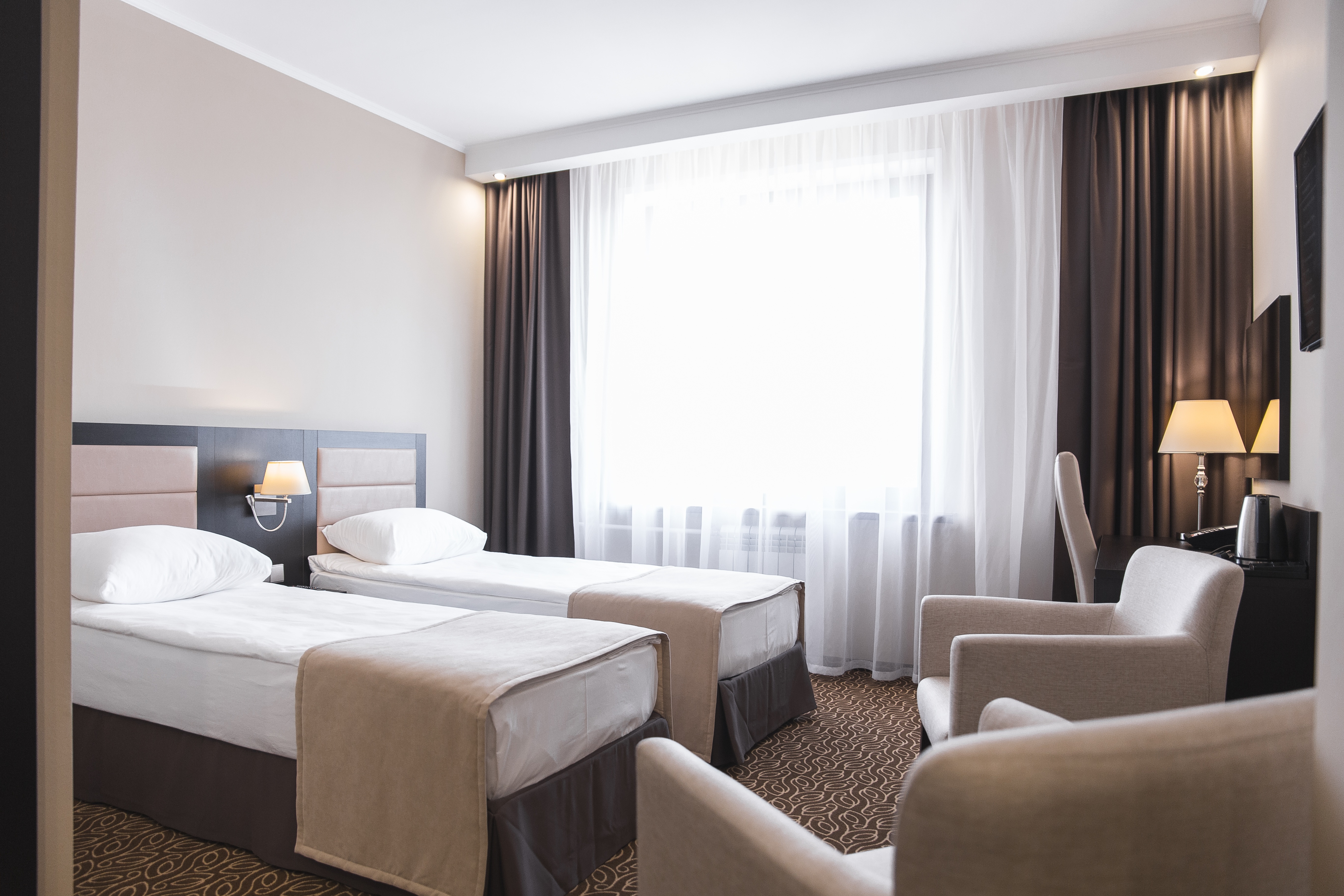 Созданные дарить комфорт, номера Стандарт оснащены всем необходимым для приятного отдыха и работы. Каждый номер располагает рабочей зоной с просторным столом, удобным креслом и двумя кроватями. Гармоничный современный дизайн продуман до мелочей интерьером отлично подойдет как для туристов, так и для бизнесменов.