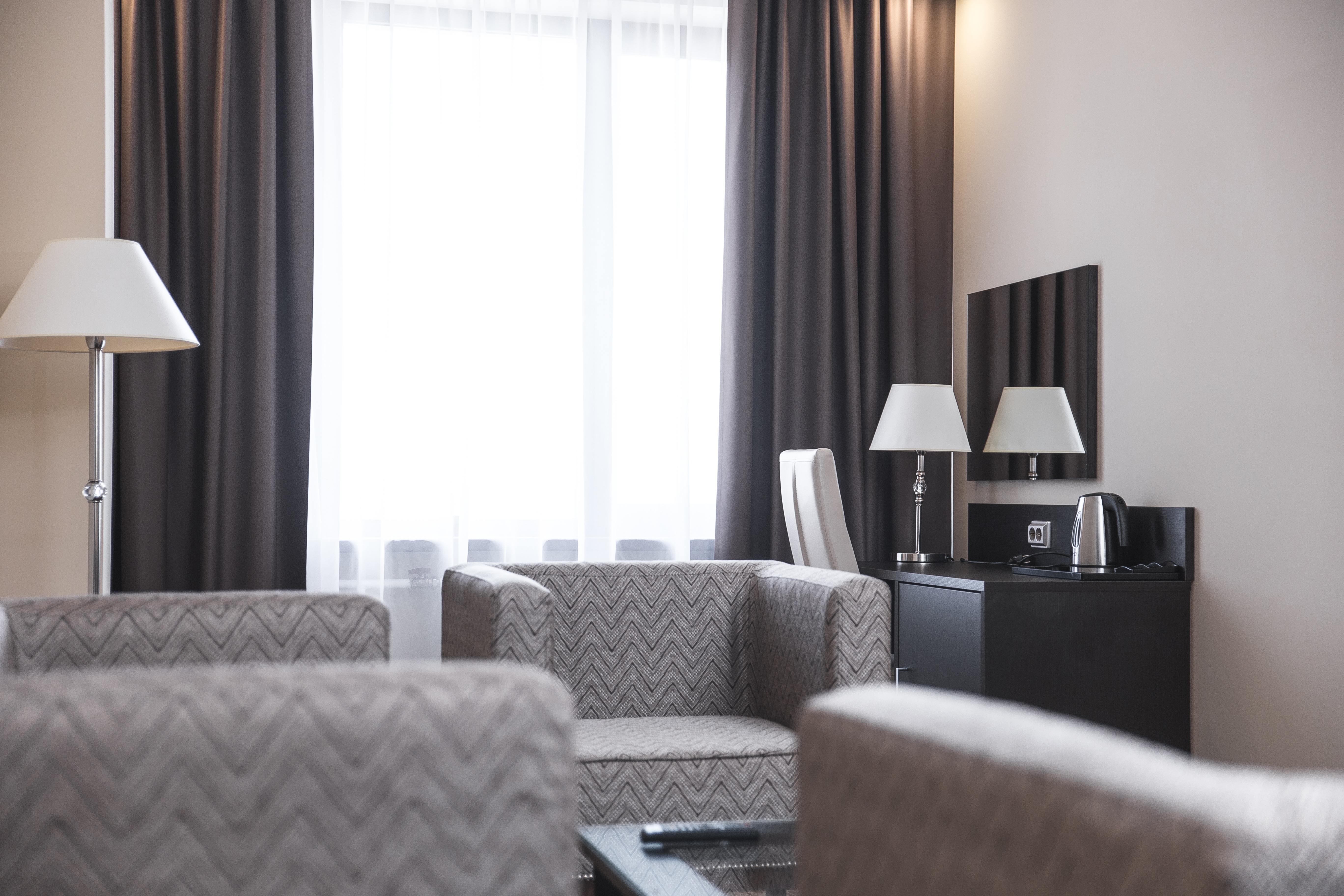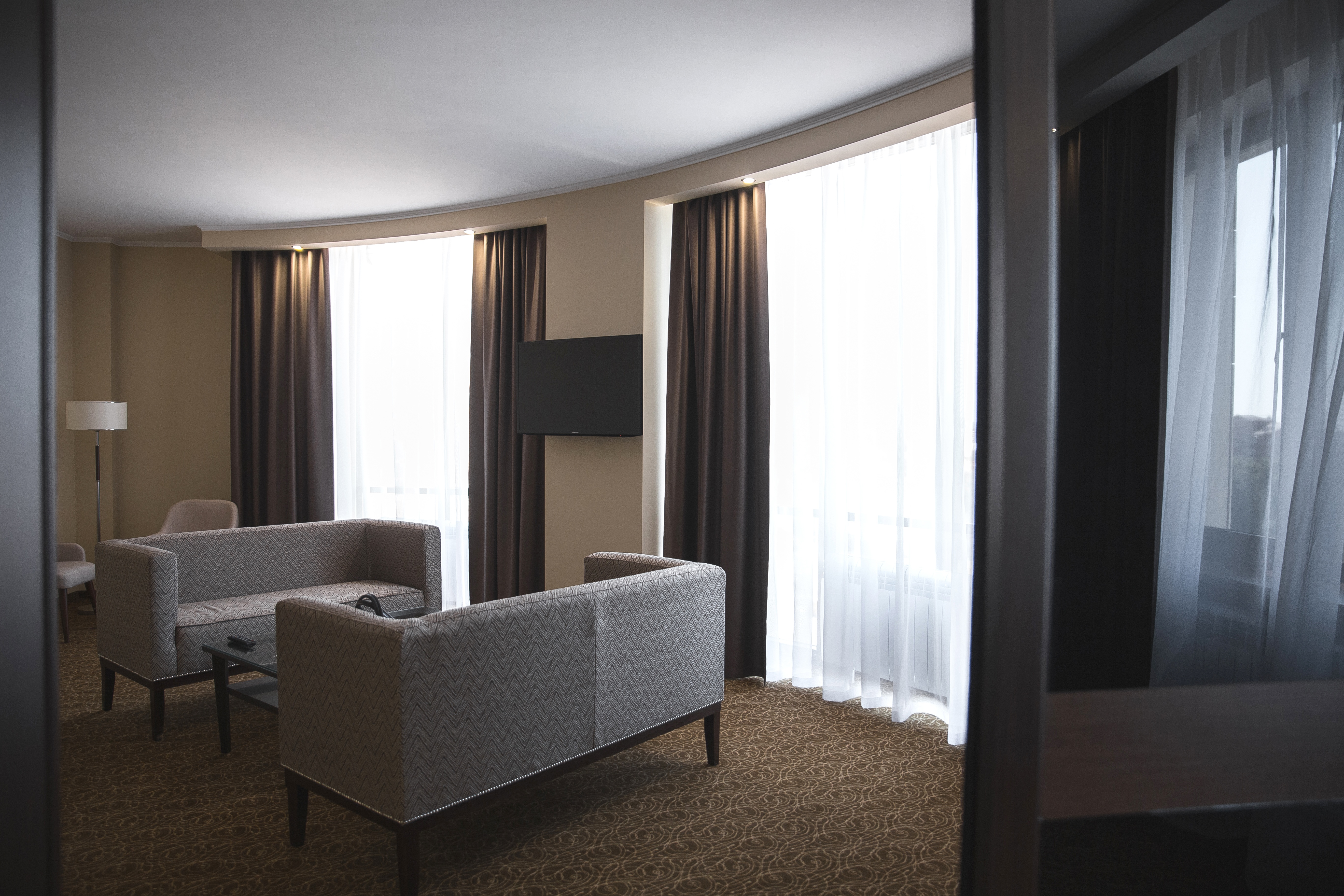 Просторный двухкомнатный номер категории Люкс с панорамными окнами и увеличенной площадью. В гостиной представлены удобный мини-диван, 2 кресла и удобный письменный стол. Пространство комнаты организовано таким образом, что она идеально подходит для вечернего отдыха и деловой встречи с коллегами. Отдельная спальня добавляет особого комфорта, четко разделяя пространство между двумя комнатами на рабочее и место для отдыха.