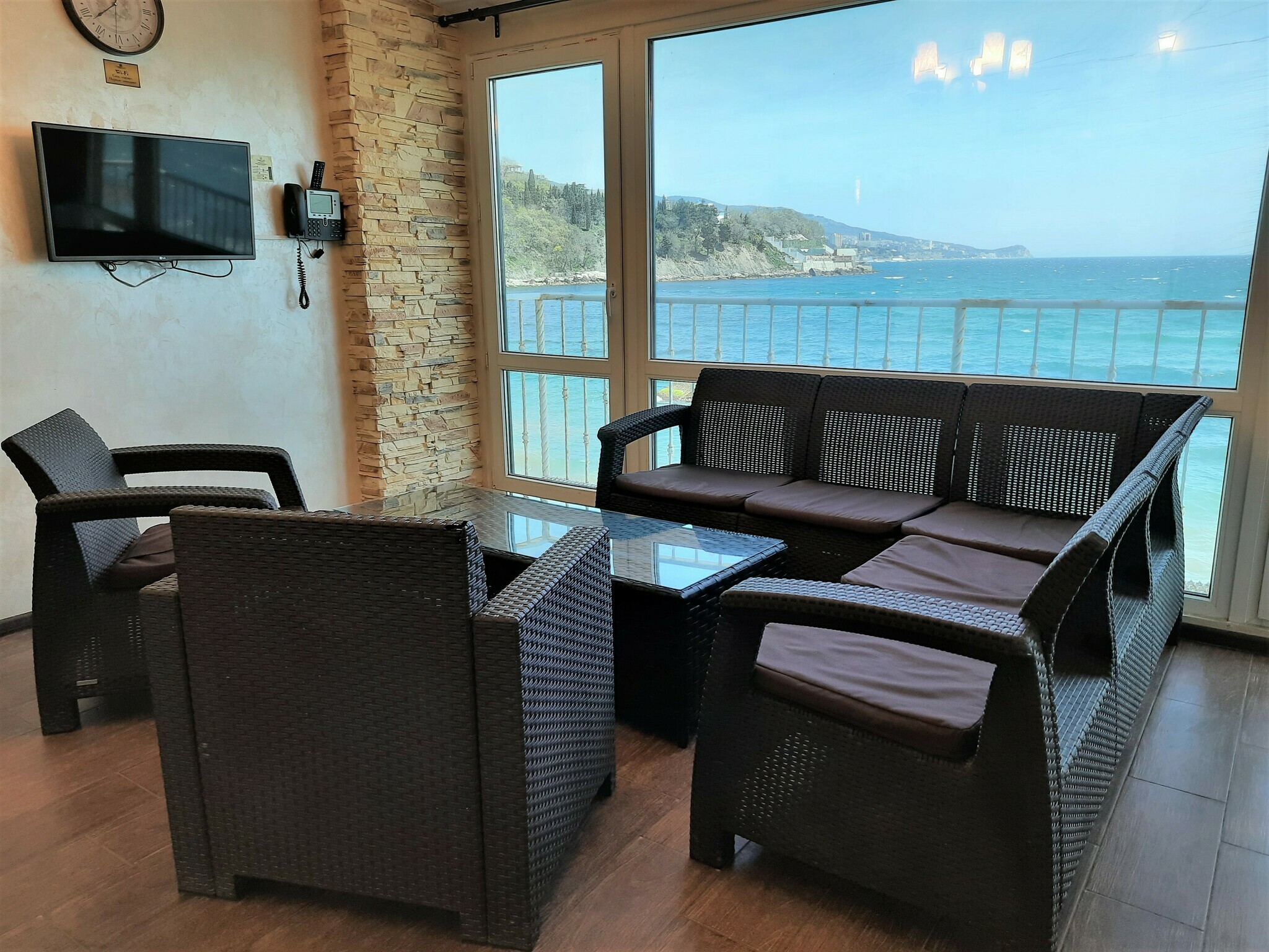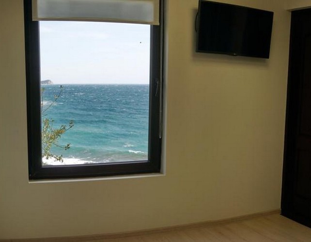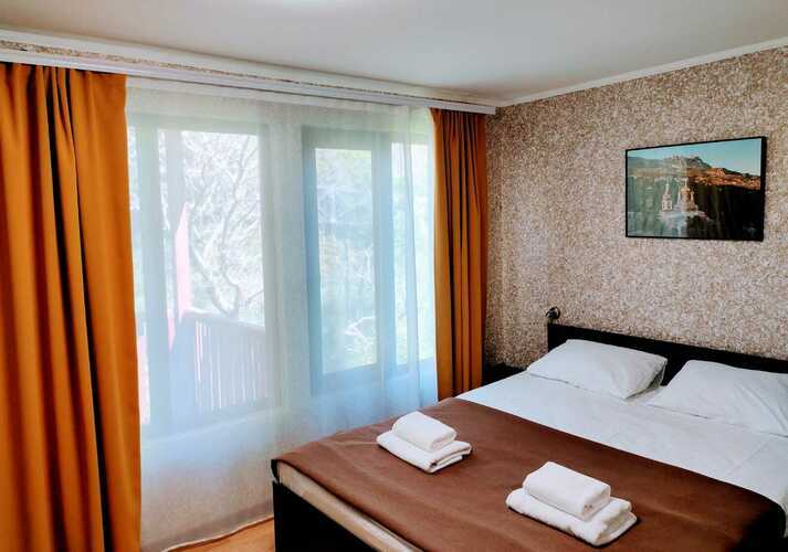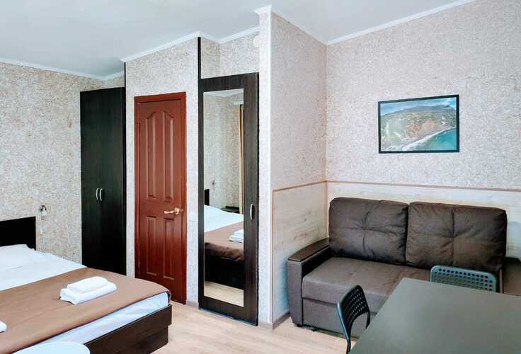 Комплектация: двуспальная кровать, прикроватные тумбочки, раскладной диван, два одежных шкафа, сейф, обеденный стол и стулья, холодильник, чайник, телевизор, кондиционер, Wi-fi, терраса. Санузел совмещен с душем. Вид на море открывается с террасы. С мая до конца сентября в стоимость проживания включены завтраки.