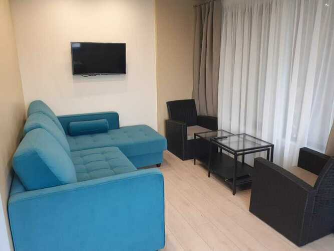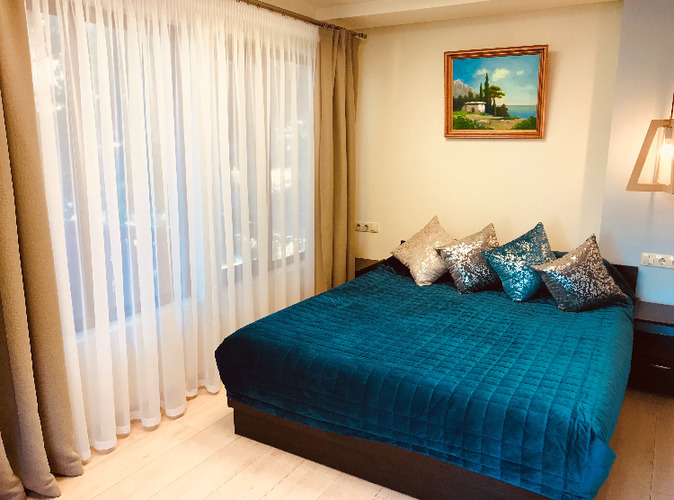 В спальне имеется одна двуспальная кровать, прикроватные тумбочки, телевизор, кондиционер, балкон с набором плетеной мебели. В гостиной: мягкий уголок, телевизор, Wi-fi, кондиционер, буфет с посудой, микроволновой печью, холодильником, чайником. Санузел совмещен с душем. Предоставляется фен, два халата. С мая до конца сентября в стоимость входят завтраки.