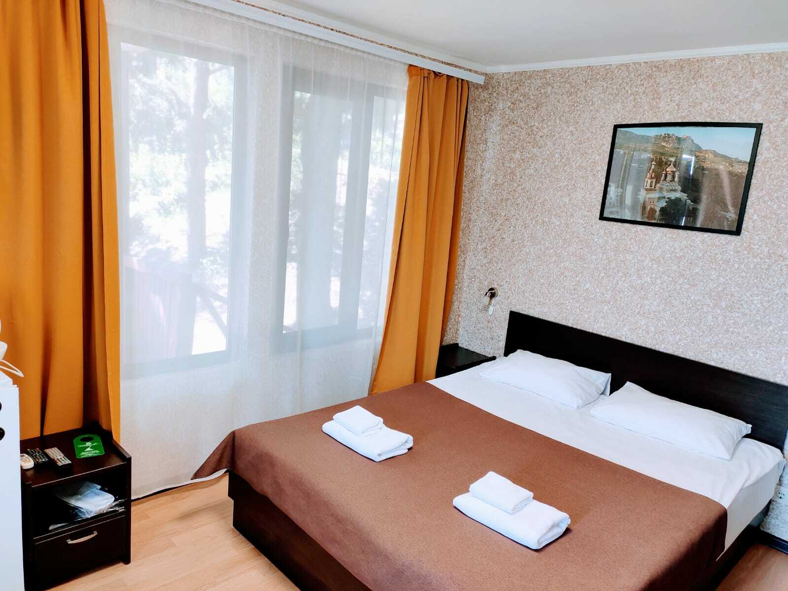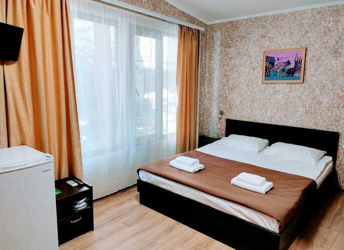 Комплектация: двуспальная кровать, прикроватные тумбочки, раскладной диван, два одежных шкафа, сейф, обеденный стол и стулья, холодильник, чайник, телевизор, кондиционер, Wi-fi, терраса. Санузел совмещен с душем. С мая до конца сентября в стоимость проживания включены завтраки.
