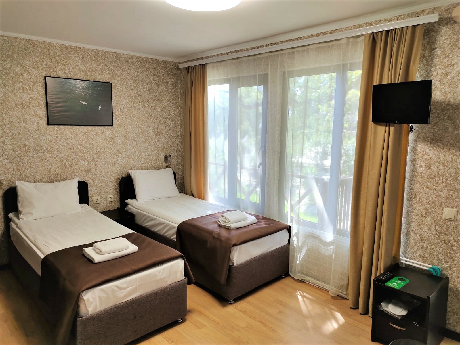 Комплектация: две односпальные кровати, прикроватные тумбочки, два одежных шкафа, сейф, мини-кухня с раковиной для мытья посуды, настольной электроплитой, холодильником, чайником и минимальным набором посуды и инвентаря (кастрюля, сковорода, тарелки, кружки, стаканы, приборы); обеденный стол и стулья, сушилка для белья. В номере имеются телевизор и кондиционер, терраса. Wi-fi работает на всей территории отеля. С мая до конца сентября в стоимость проживания включены завтраки.