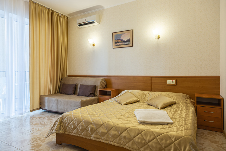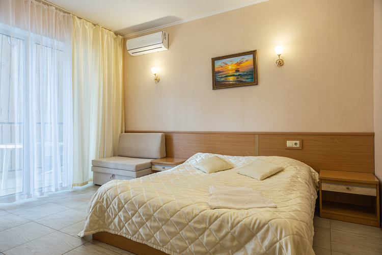 Удобный современный 2-х местный номер , площадью 24 м.кв. с открытой террасой 9 м.кв. 1на двух спальная кровать,раскладной диван кровать телевизор, чайник, холодильник, шкаф для одежды,сейф. Ванная комната с душем, горячая и холодная вода круглосуточно. Балкон с боковым видом на море.