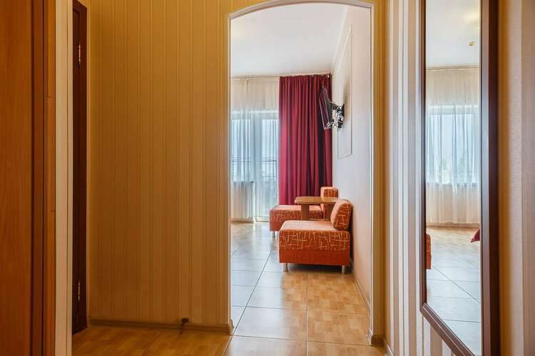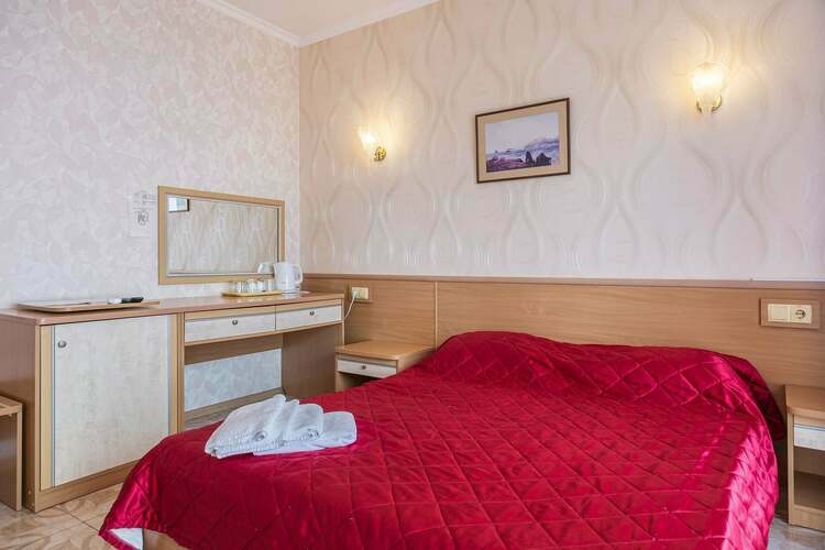 Номер категории полулюкс оснащен всеми удобствами! Удобный современный 2-х местный номер , площадью 24 м.кв. с открытой террасой 9 м.кв. В красном номере двухспальная кровать, раскладное дополнительное место, телевизор, чайник, холодильник,шкаф для одежды,сейф. Ванная комната с душем, горячая и холодная вода круглосуточно. Балкон с боковым видом на море.