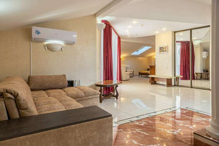 На 5-ом этаже расположен "пентхауз" - это великолепно оборудованные и отделанные апартаменты, пощадьй 80 м.кв, Огромным балконом с 32х м терассой с видом на море. В пентхаусе двуспальная кровать, большой угловой диван,раскладной диван, плазменный телевизор, холодильник, сейф, чайник, обеденный стол,гардеробная,горка с посудой для еды. Уборная с ванной и окном на потолке для отдыха в ванной и лицезрения звезд. Огромная терасса 32м2 с шикарным видом на море и уголком для отдыха.