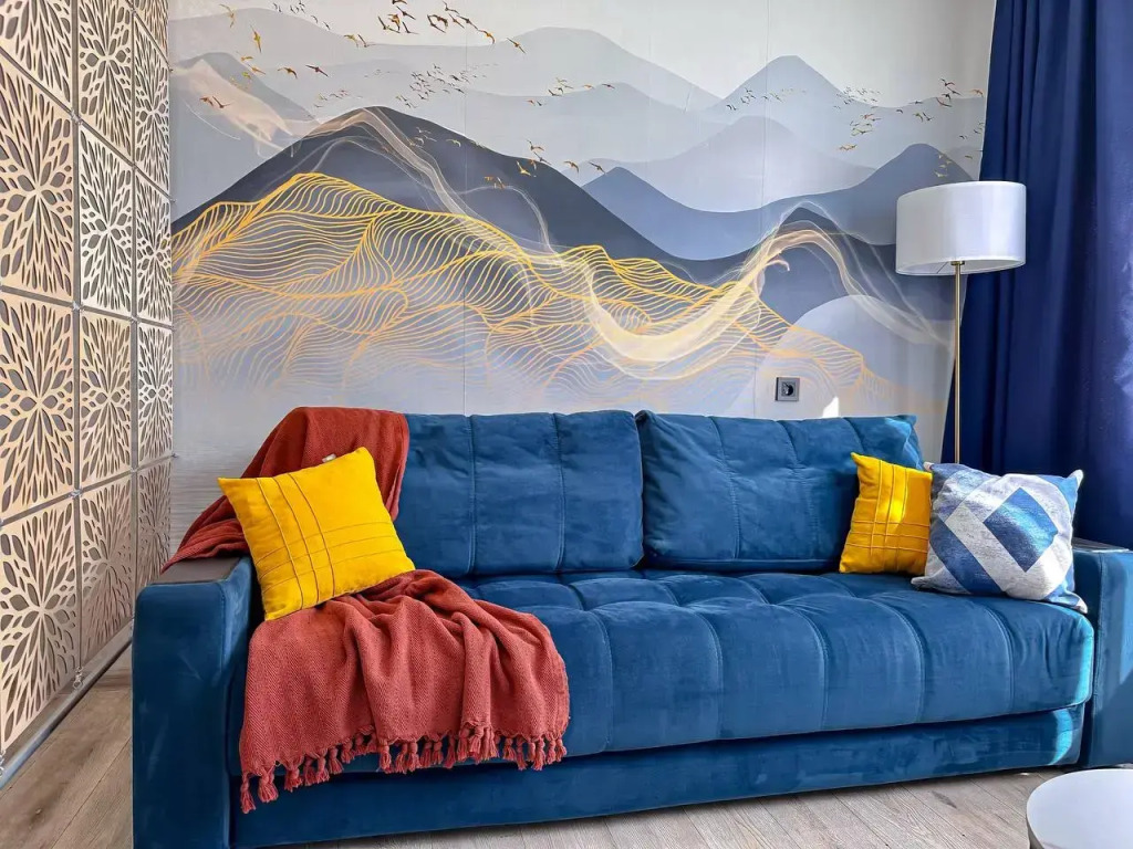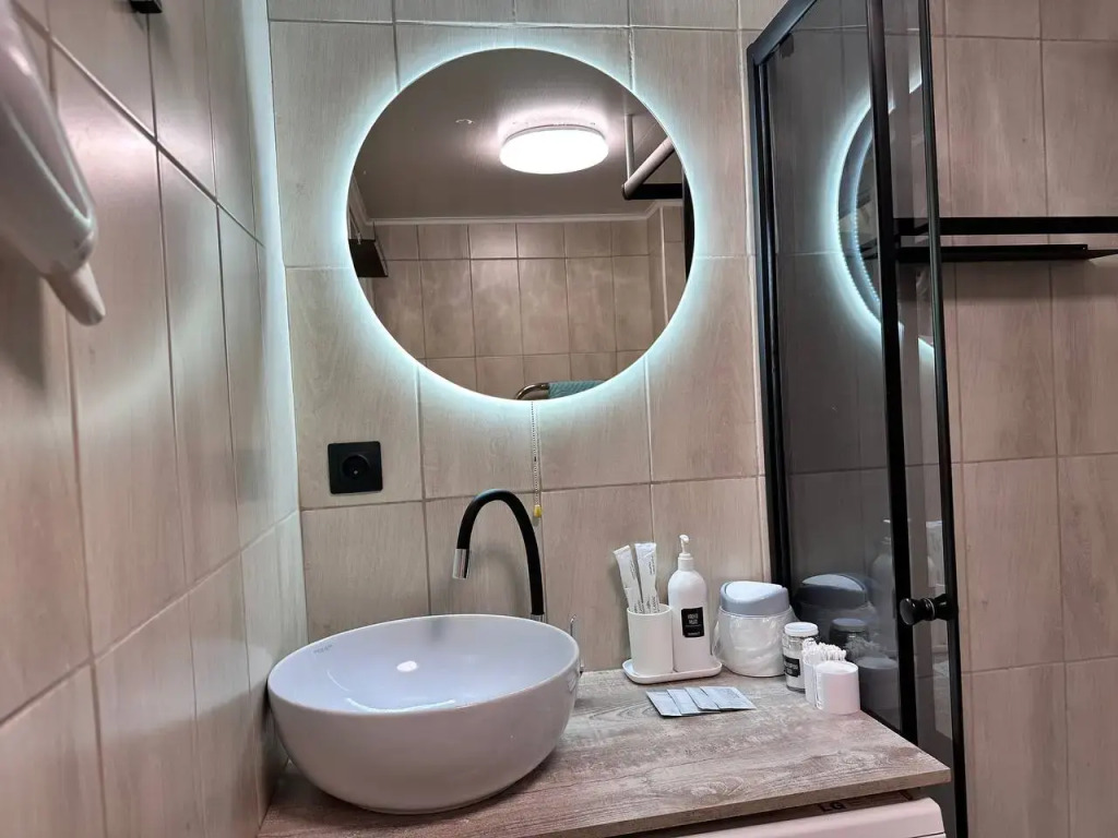 Площадь квартиры — 32 кв. м. В квартире предусмотрено два раздельных спальных места: двуспальная кровать с ортопедическим матрасом и двуспальный диван-кровать. Доступен wi-Fi.