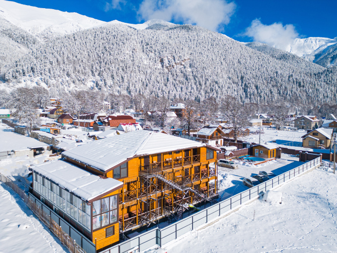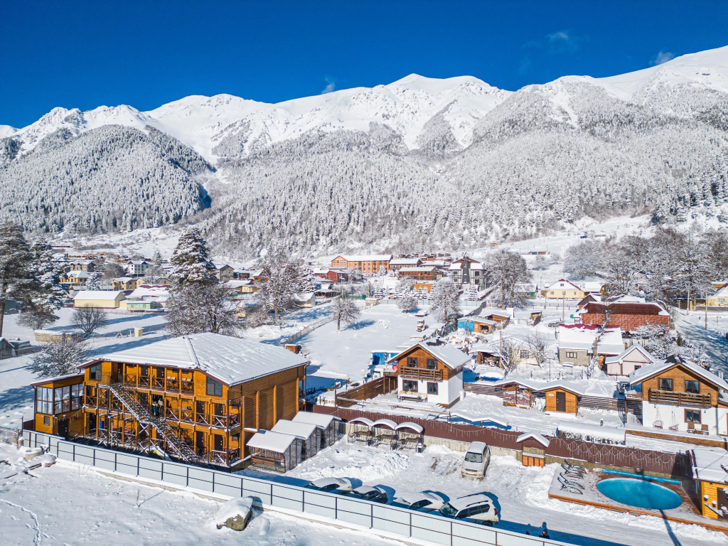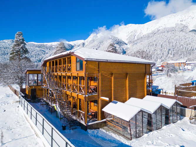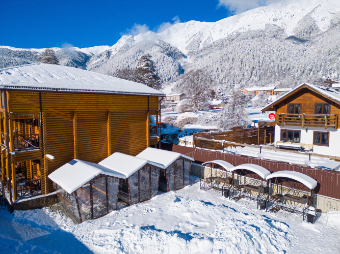 На территории отеля обустроена мангальная зона, оснащённая крытыми мангалами и утеплёнными беседками, детская спортивная мини-площадка, большая охраняемая парковка и комната для сушки лыжного снаряжения.