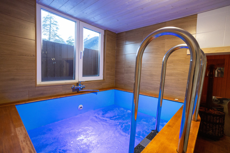 Также на территории есть подогреваемый бассейн, общая кухня, за отдельную оплату гости могут посетить баню с купелью-джакузи.