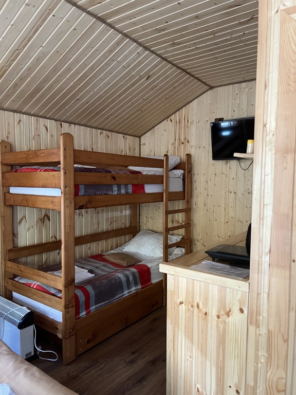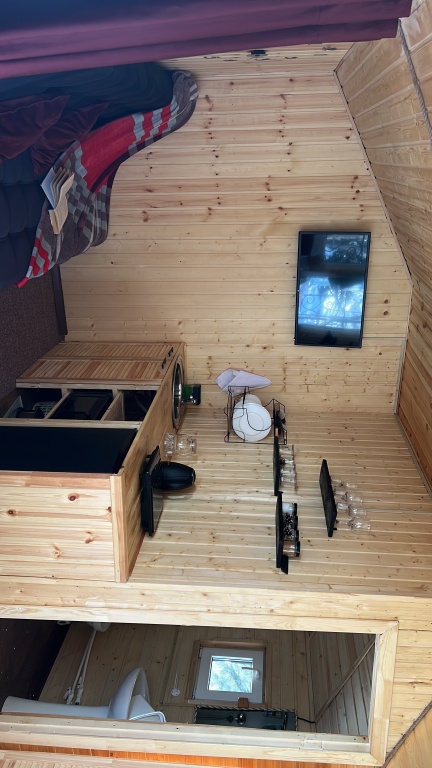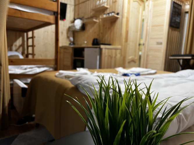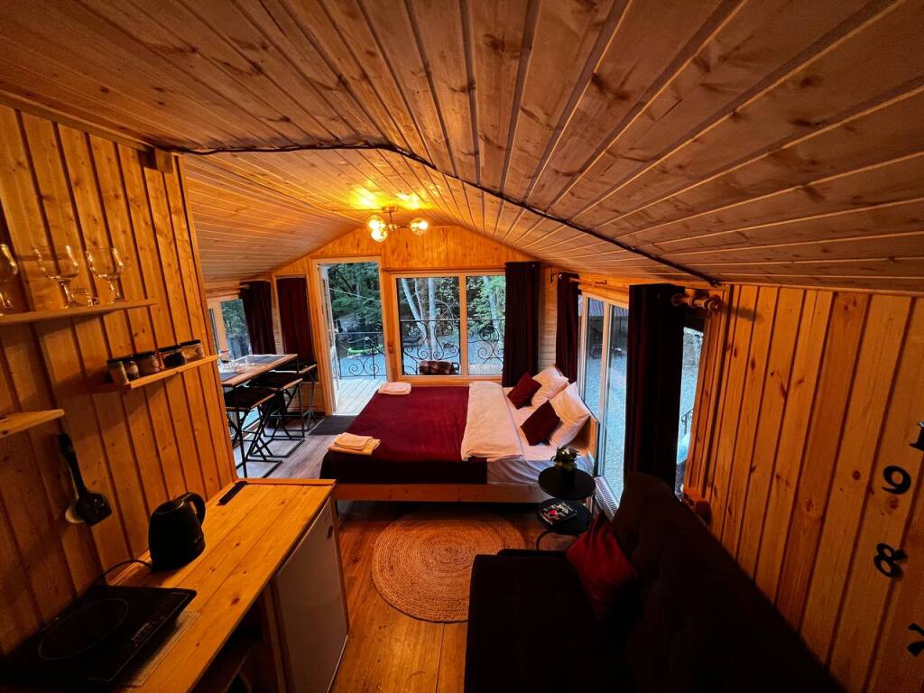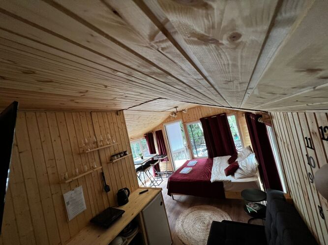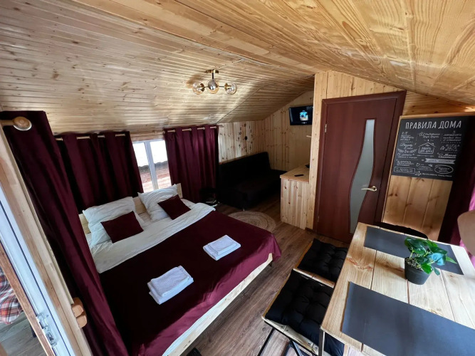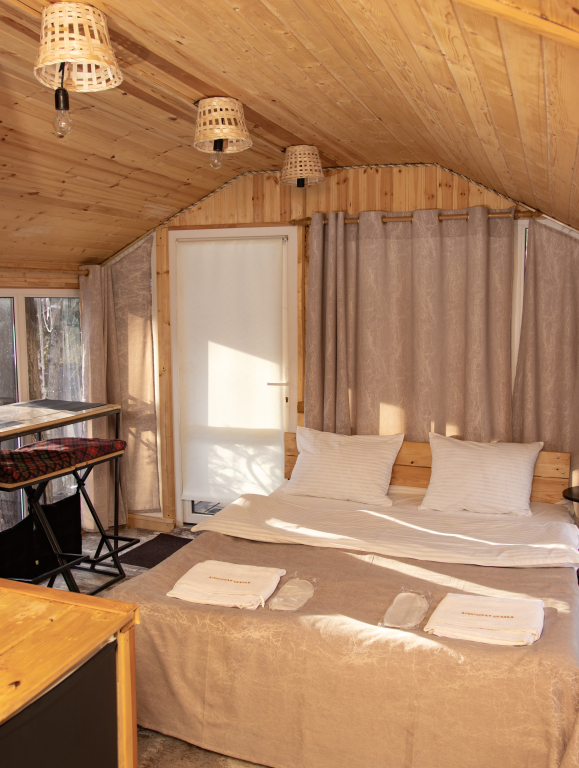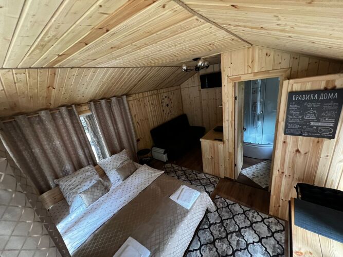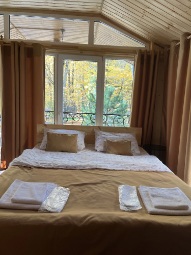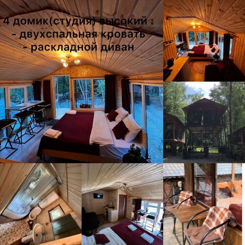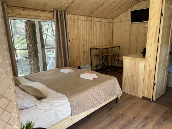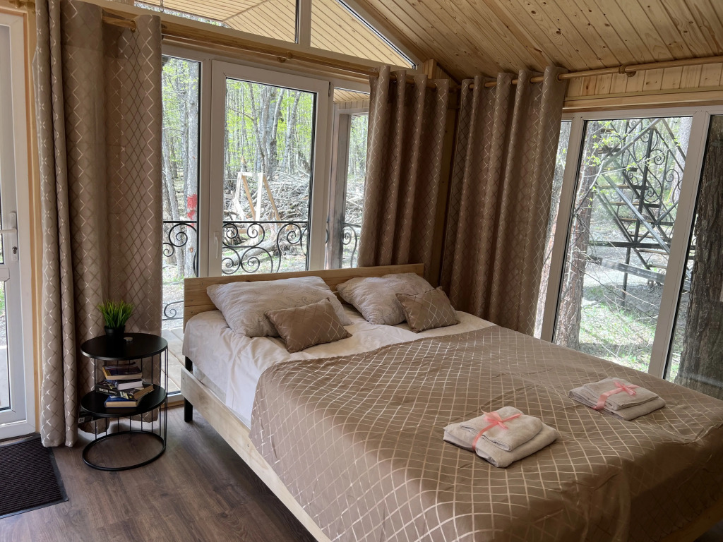 В домиках с панорамными окнами, из которых открывается вид на лес, есть санузел, душевая кабина, гигиенические средства, тапочки и постельное бельё.