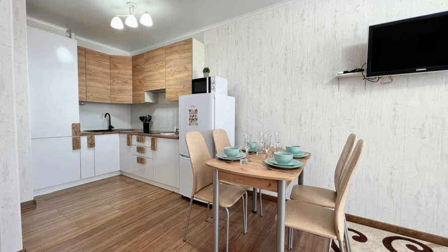 Кухня укомплектована необходимой посудой и техникой.