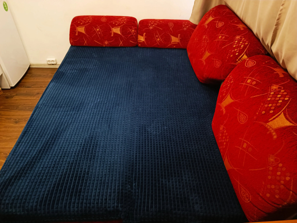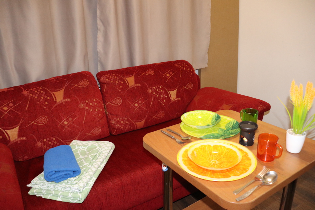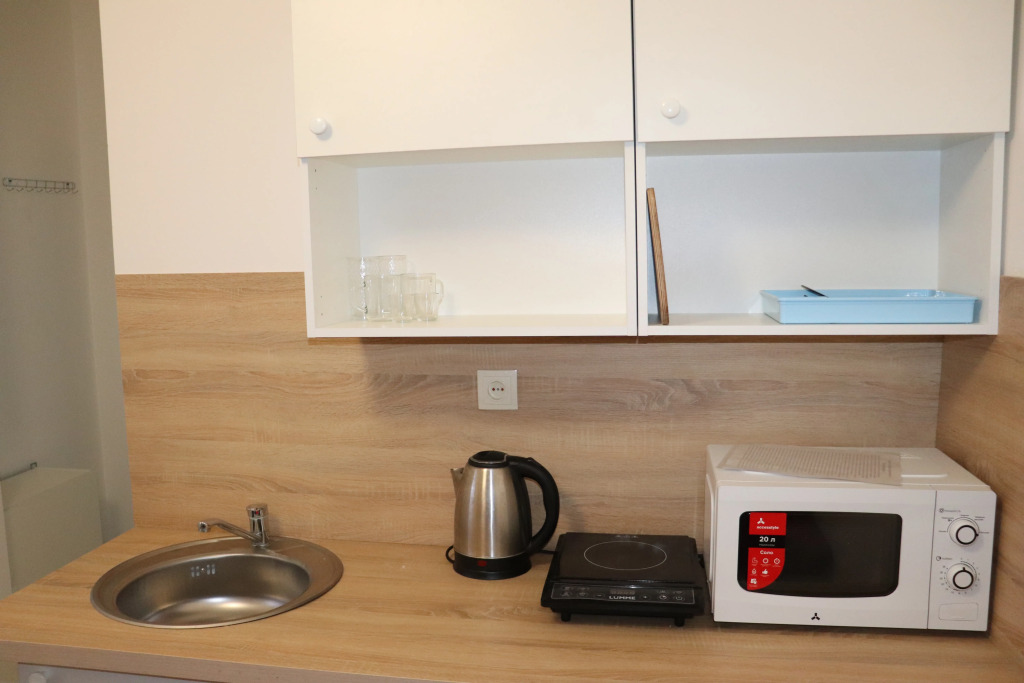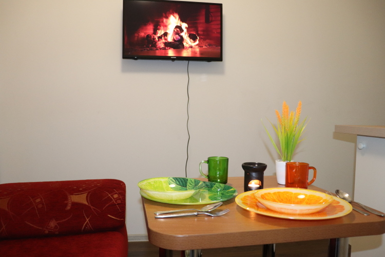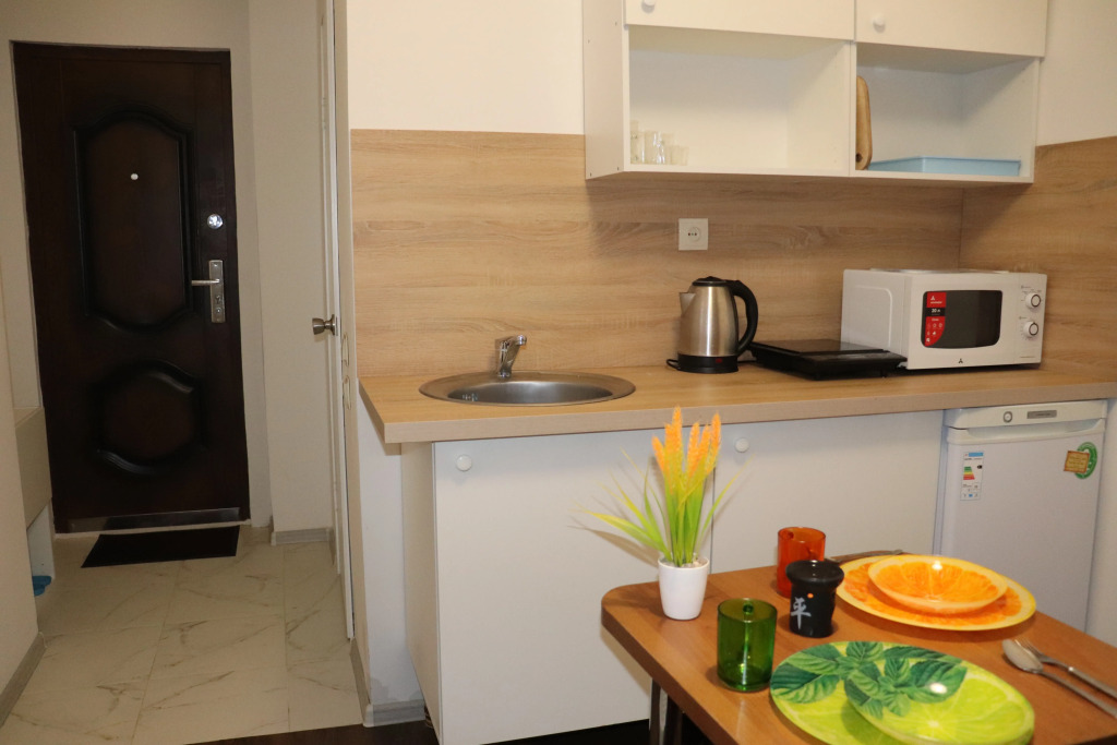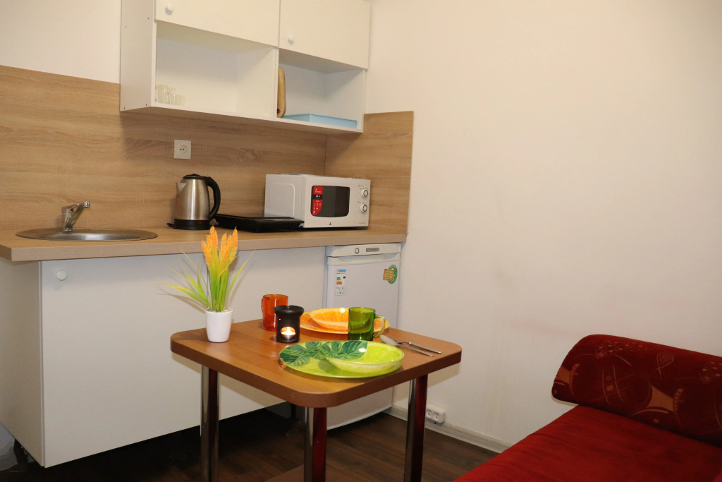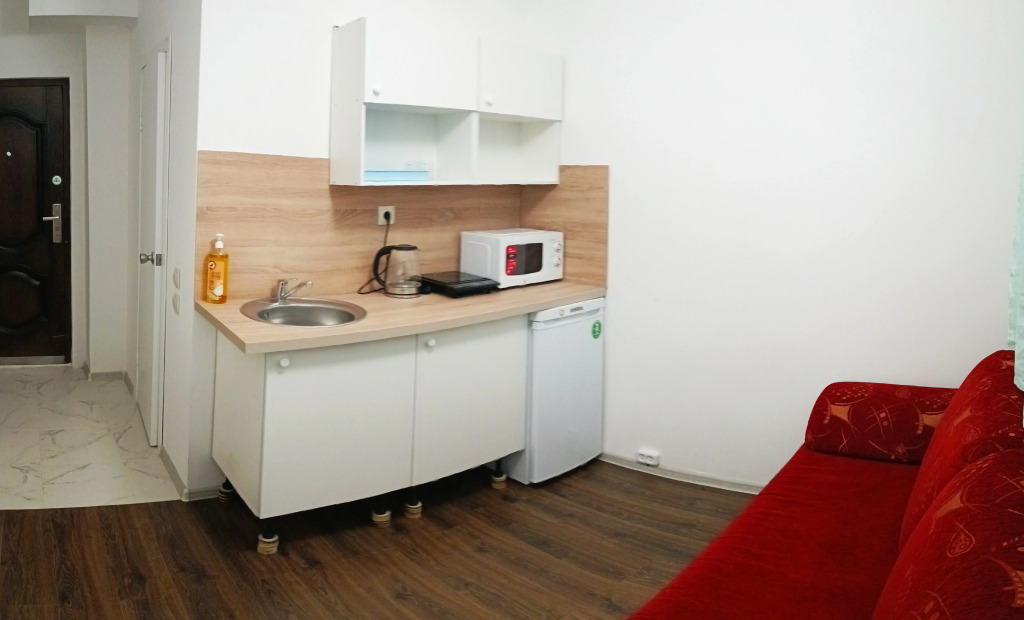 В комнате двуспальный раскладной диван, обеденный стол со стульями, встроенная кухня с мебелью, техникой, посудой и столовыми приборами. Также в распоряжении гостей: Wi-Fi, Smart-ТV, постельное бельё и полотенца. Также есть санузел с душевой кабиной.