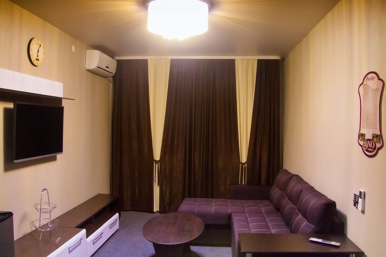 Номер категории «люкс» - современный и уютный, с системой кондиционирования воздуха и всеми удобствами. В нем имеется просторная гостиная с мини-кухней, с диваном, два телевизора SMART, журнальный столик, а также спальня, меблированная двуспальной кроватью, туалетным столиком, тумбочкой для личных вещей и вместительным шкафом для одежды. Санузел номера «люкс» оборудован всем необходимым. Выход в Internet по технологии Wi-Fi (бесплатно).