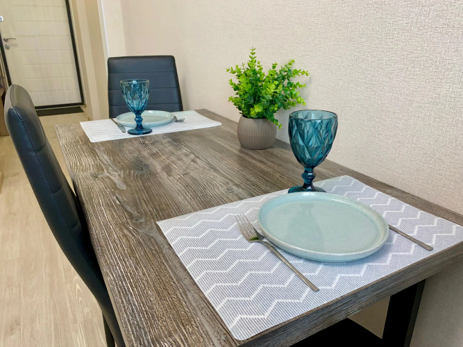 К услугам гостей в апартаментах есть двуспальная кровать-трансформер с ортопедическим матрасом, раскладное кресло, посуда для приготовления пищи и сервировки стола, Smart ТV, Wi-Fi, постельное бельё и полотенца. А также туалетно-косметические принадлежности — гель и мыло, порошок и шампунь. Для удобства гостей здесь также есть фен, утюг, гладильная доска, стиральная машина, сушилка для белья. Апартаменты размещают до 4 гостей. Для гостей с детьми до 1 года по запросу за дополнительную плату предоставляется детская кроватка, а также детская площадка во дворе.