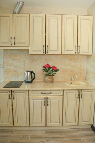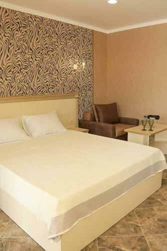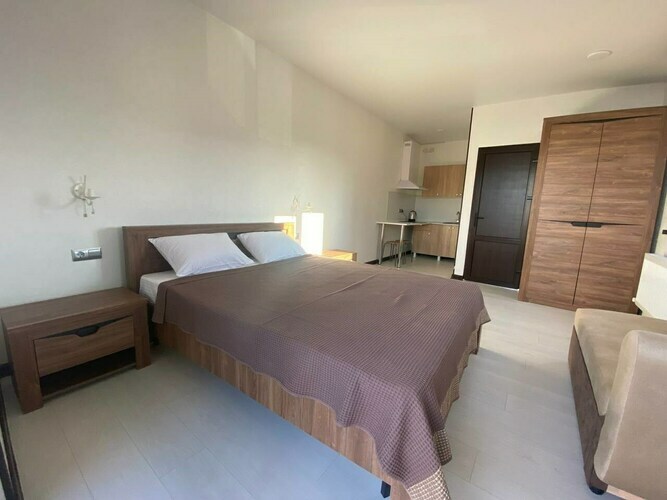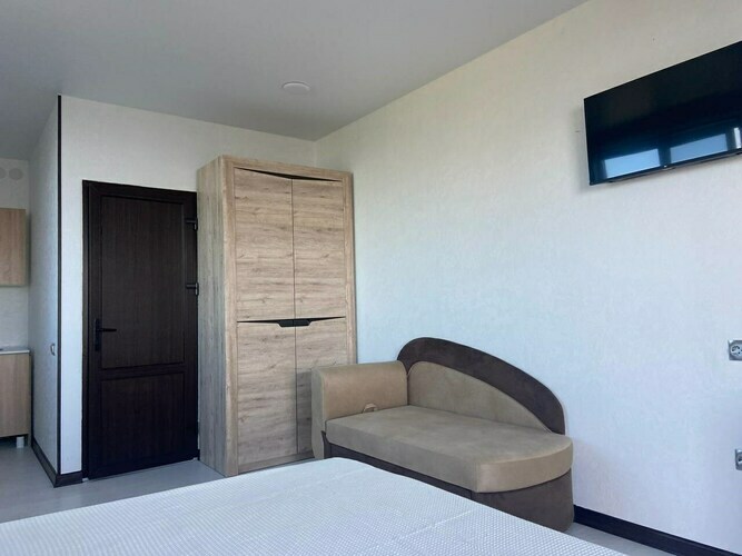 Однокомнатный номер студия одна большая кровать, раскладное кресло и мини-кухня Уютный номер для размещения от 2 или 3 человек. Площадь номера от 20 до 30 м2. В комнате одна большая кровать и раскладное кресло, обеденная зона, кухня, холодильник, посуда, чайник, ТВ, кондиционер, шкаф. В ванной комнате: фен, душ, санузел, комплект полотенец. В каждом номере нашего отеля работает бесплатный Wi-Fi. Утюг с гладильной доской – на каждом этаже. Периодичность смены постельного белья – 1 раз в 5 суток.