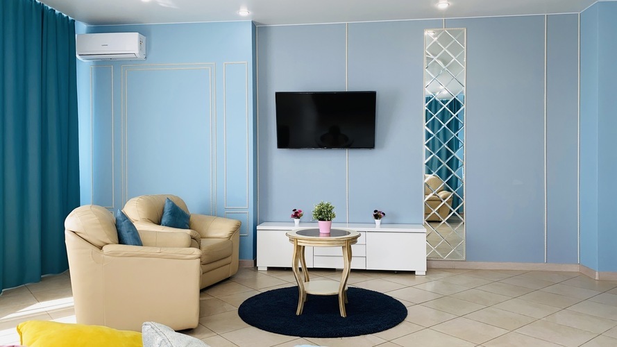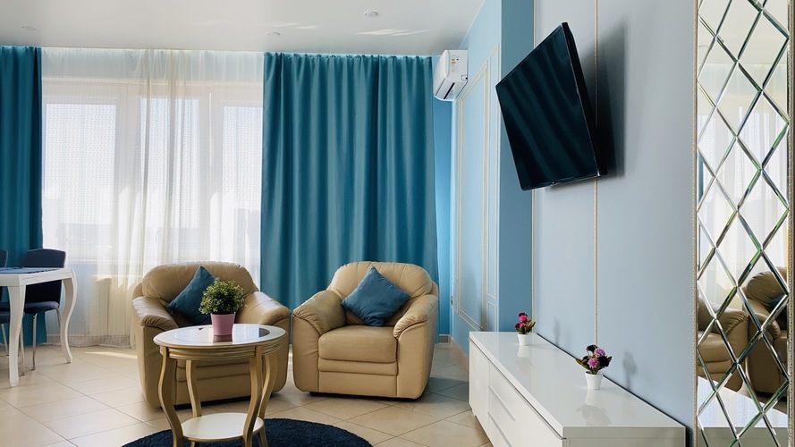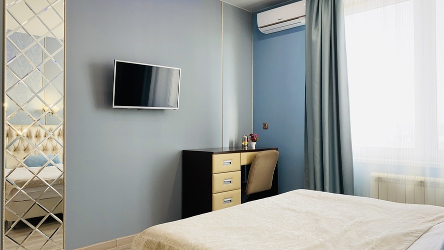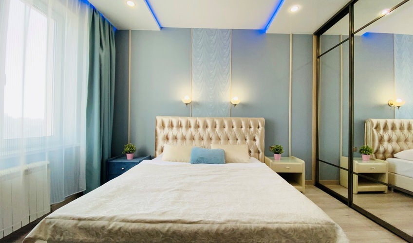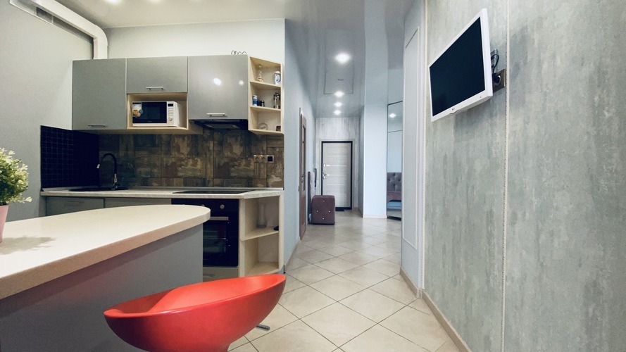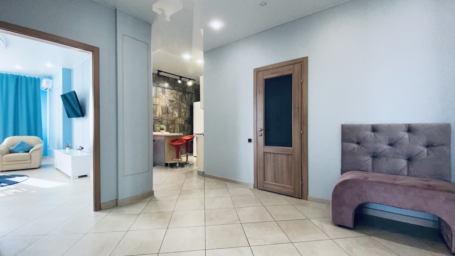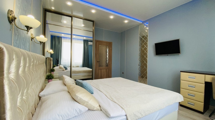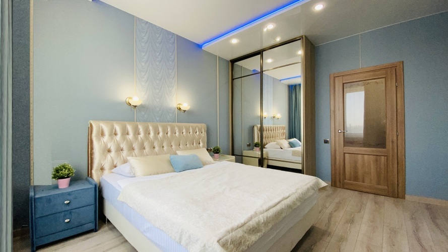 Практичное и лаконичное использование пространства холла, объединенного с кухонной зоной и укомплектованного разнообразной мебелью со стильными деталями интерьера, сочетается в данных апартаментах с элегантностью планировки и эффектом зазеркалья, ярко акцентированных в спальне. Просторный диван при необходимости трансформируется в полноценную двуспальную кровать. В спальне - авторская двуспальная кровать с LED-подсветкой итальянского дизайнера Bonvichini. Из спальни есть выход на балкон.