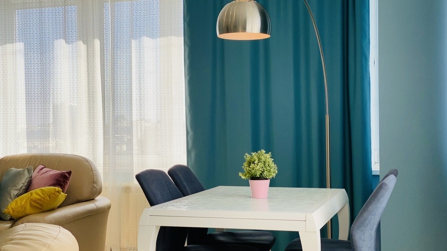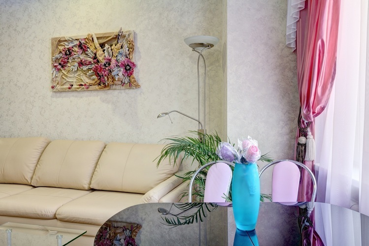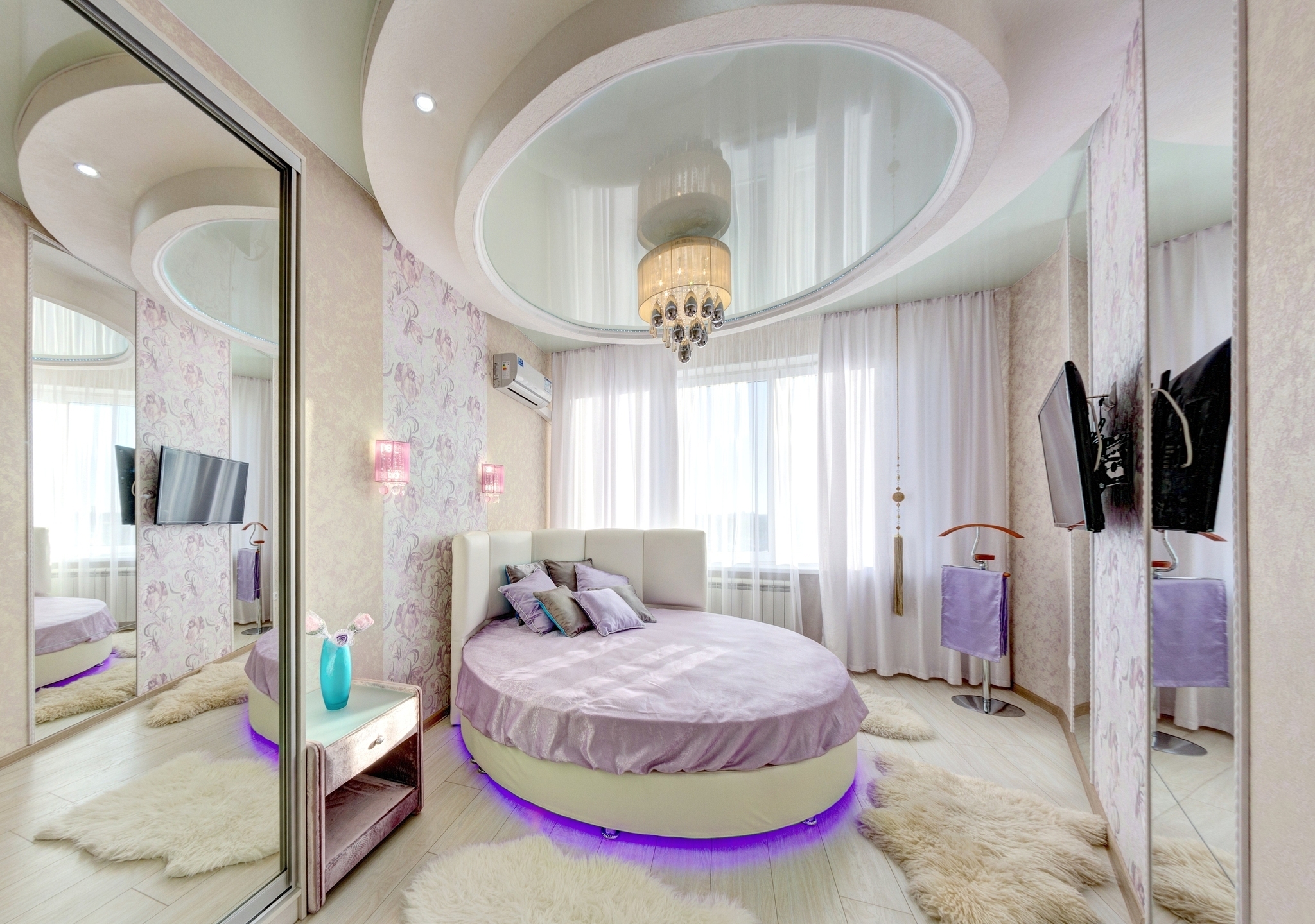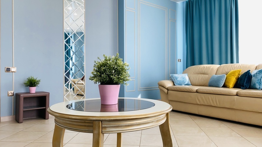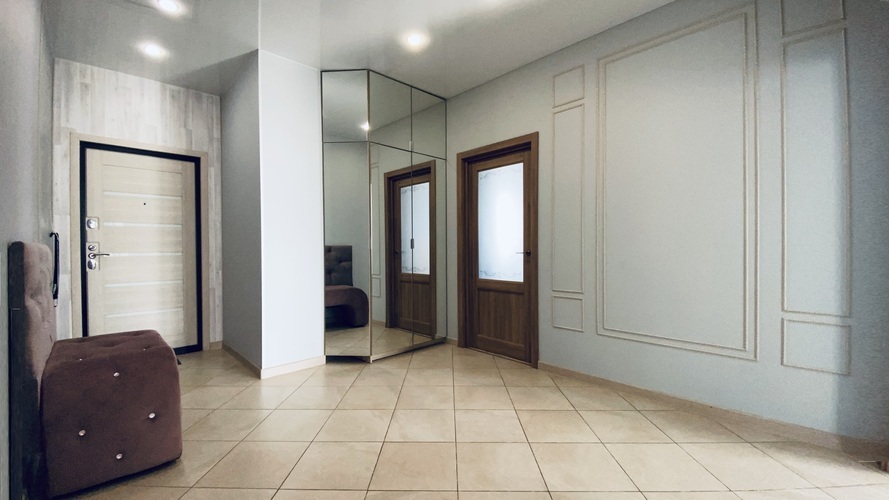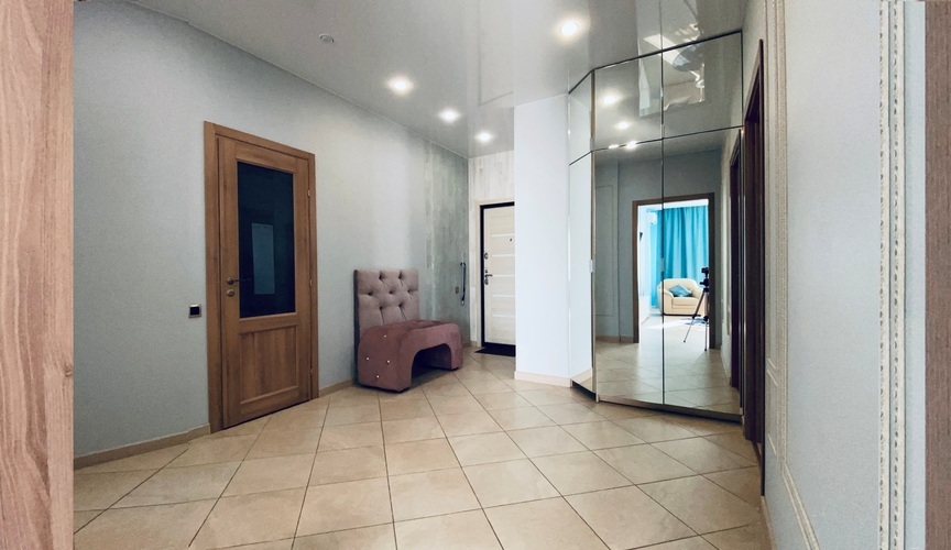 Практичное и лаконичное использование пространства холла, объединенного с кухонной зоной и укомплектованного разнообразной мебелью со стильными деталями интерьера, сочетается в данных апартаментах с элегантностью планировки и эффектом зазеркалья, ярко акцентированных в спальне. Просторный диван при необходимости трансформируется в полноценную двуспальную кровать. В спальне - авторская двуспальная кровать с LED-подсветкой итальянского дизайнера Bonvichini. Из спальни есть выход на балкон.