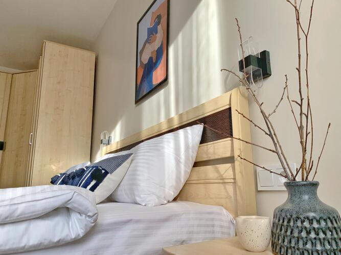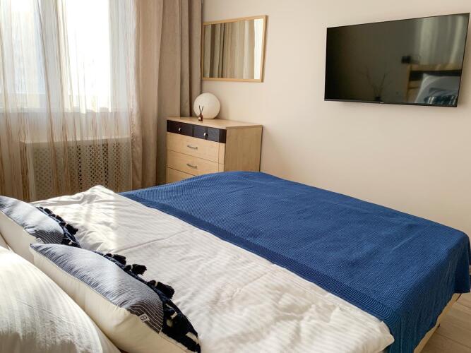 Двухкомнатная квартира оборудована двумя раздельными комнатами со спальными местами, кухней, постельным бельём, кондиционером в двух комнатах, блэкаут шторами. Для детей доступны: стульчик для кормления, горшок, планшет для рисования, игрушки, детские тв-каналы со Smart-TV. К услугам гостей игротека с настольными играми и подписка на онлайн-кинотеатр. На кухне — система очистки воды обратного осмоса. В распоряжении гостей места хранения, стиральная машина с порошком и гладильная доска с утюгом.