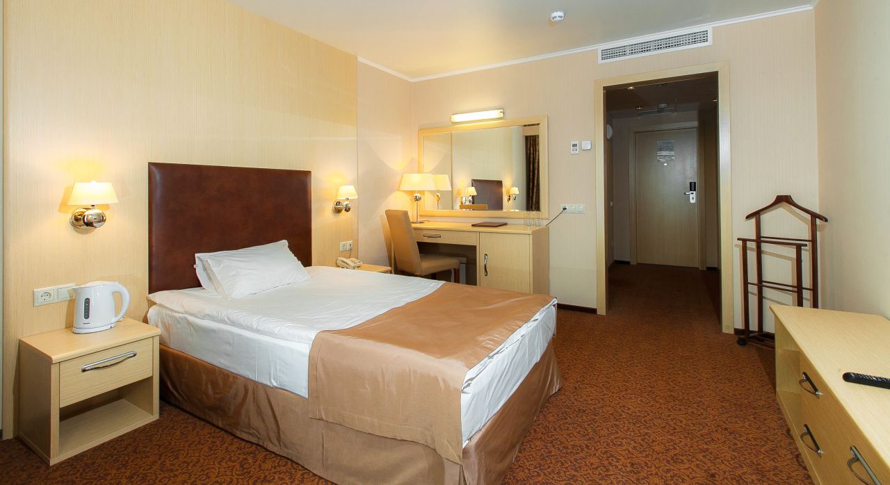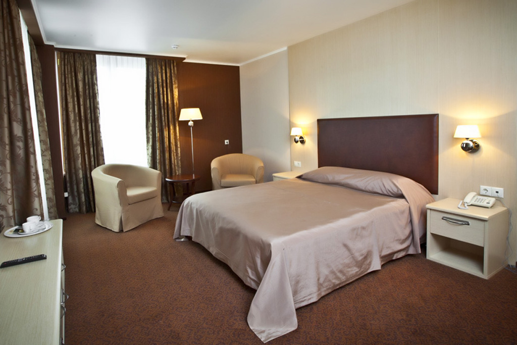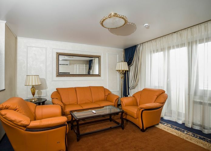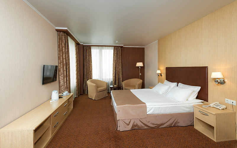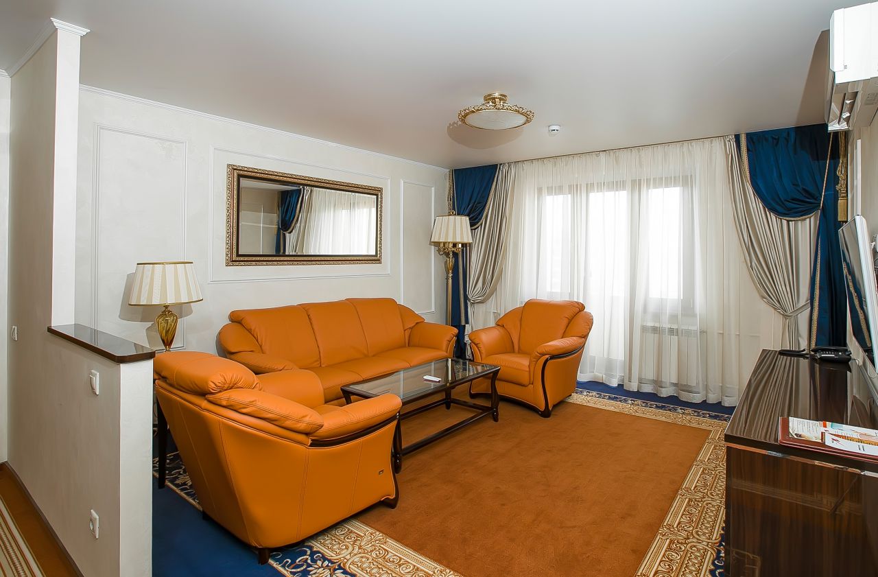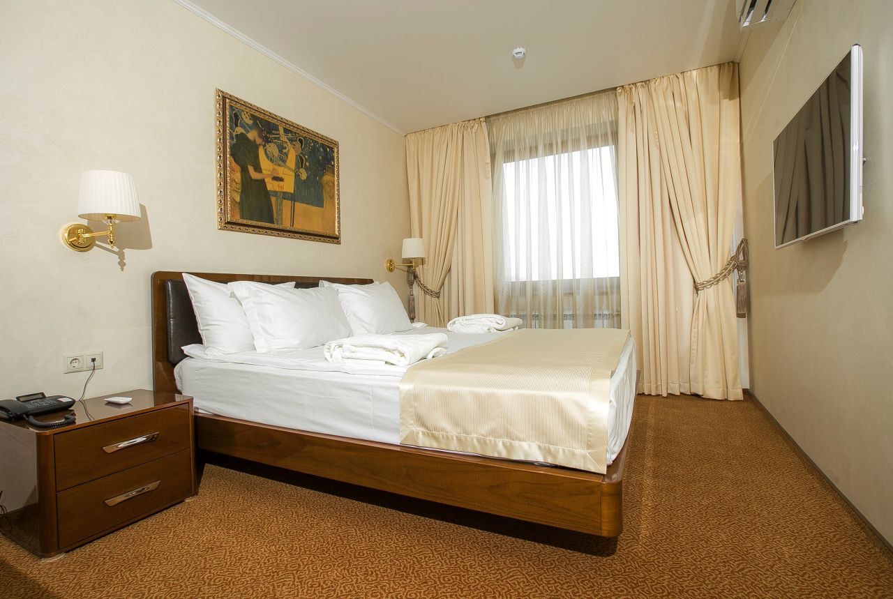 Просторный 2-х комнатный номер - спальня, гостиная и кухня. Идеально подходит для гостей, планирующих остановиться в отеле на длительный период. Наличие оборудованной кухни с посудой делает пребывание гостей удобным и более доступным. Оборудован: кровать 160 см*200, ванная, мини-бар, спутниковое ТВ, прямая международная телефонная линия, Wi-Fi-доступ в Интернет, кондиционер.