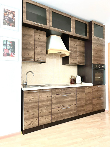 Квартира-студия вмещает до 4-х гостей. В квартире есть: двуспальная кровать, раскладной диван со спальным местом 120 см, телевизор, WI-FI, холодильник, СВЧ-печь, варочная поверхность, духовой шкаф, стиральная машина, утюг, гладильная доска, фен, чайник, посуда, предметы гигиены, постельное бельё и полотенца.