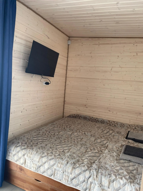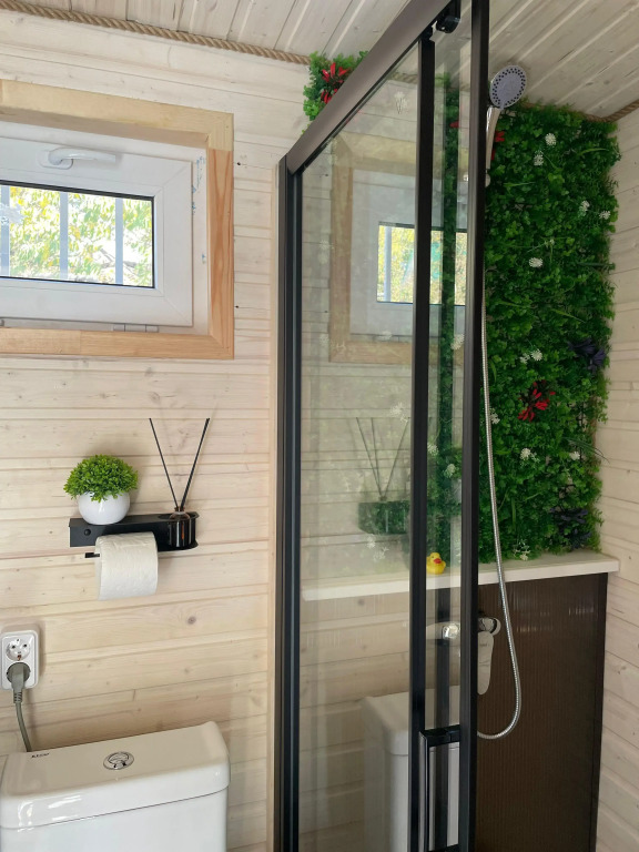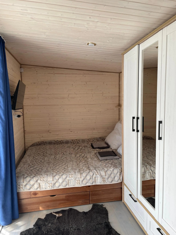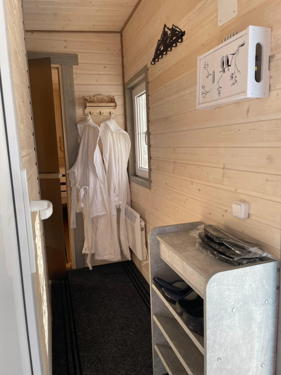 Гостевой дом состоит из двух одинаковых модулей, соединённых между собой. В жилом модуле находится двуспальная кровать, шкаф, детская раскладная кровать, телевизор, панорамное окно, обеденный стол с 4 стульями, кухонный гарнитур с холодильником, микроволновкой и газовой плитой. В банном модуле — парная 3х2 с печью на дровах, санузел с раковиной, унитазом, душевой кабиной и стиральной машиной. На террасе размером 6х3.5 располагается купель с подогревом и стол с двумя стульями.