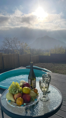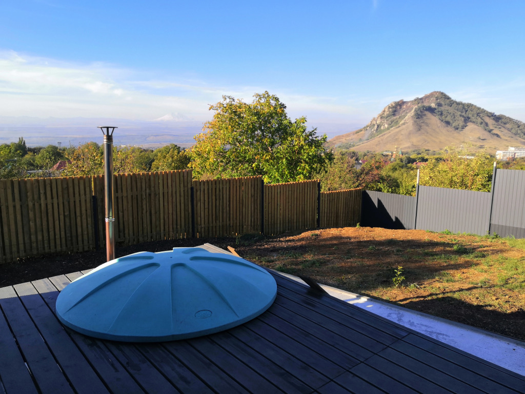 В номере есть тапочки, гигиенические принадлежности, халаты, полотенца, фен, чайник, чай, кофе, сахар и горные травы для баньки. На террасе под открытым небом расположена всесезонная купель с температурой воды 35° и вид на Кавказский Хребет и гору Эльбрус.