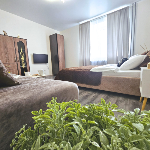 Номер уютно обставлен и оснащён необходимым, чтобы отдохнуть после долгого и насыщенного дня. Имеются телевизор. Перечисленные услуги есть не во всех номерах.