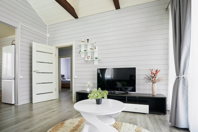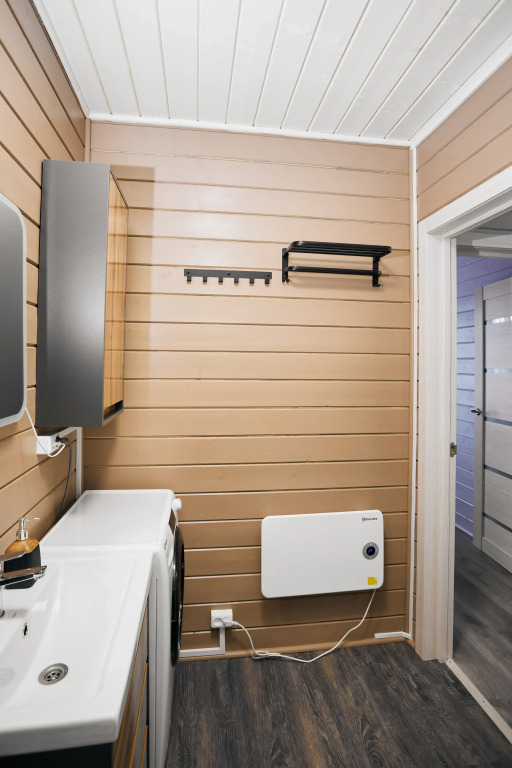 К услугам гостей 2 спальни c двуспальными кроватями, в каждой из которых имеется подъёмный механизм, предоставляющий место для хранения вещей. Гостиная оснащена панорамными окнами, диваном и телевизором со Smart TV и Wi-Fi. Санузел оборудован тёплым полом, душевой кабиной и стиральной машиной.