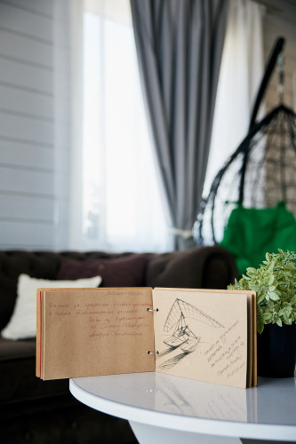 К услугам гостей дом площадью 74 кв. м с панорамными окнами и видом на лес. Участок временно не огорожен. Площадь участка — 14 соток, основание — песок.