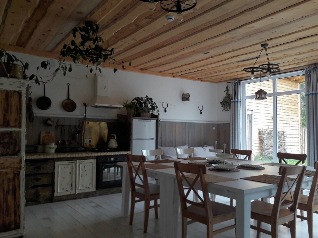 На первом этаже: зал с двуспальным диваном, кухонным гарнитуром, совмещённая ванная комната. На втором этаже: 3 спальни в каждой по двухместной кровати шириной 160 см. В распоряжении гостей: полотенца, туалетные принадлежности, чистящие средства. В доме есть: варочная поверхность, электрический духовой шкаф, микроволновая печь, необходимая посуда, телевизор,