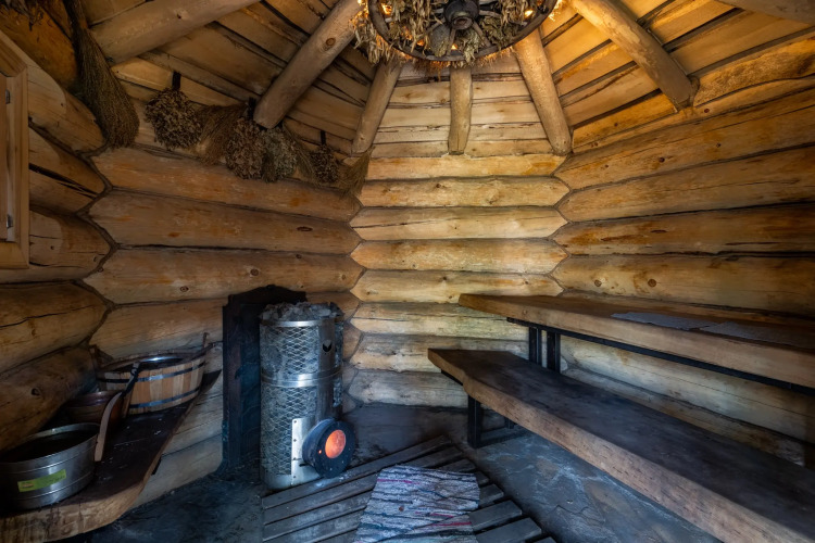 Банный комплекс с арома-баней, парной на дровах и горячим чаном на открытом воздухе рассчитан на 8 человек и включает баню разогрева «Травница», баню пара «Здравница», холодную купель, горячий чан «Дышань» и дом для отдыха «Чаевня».