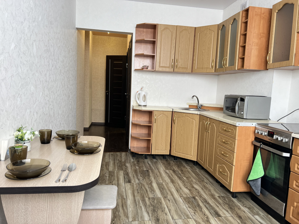 К услугам гостей однокомнатные апартаменты с бытовой техникой: есть стиральная машина, холодильник, микроволновая печь, электрический чайник, утюг, гладильная доска, сушилка. Кухня укомплектована посудой и столовыми приборами.