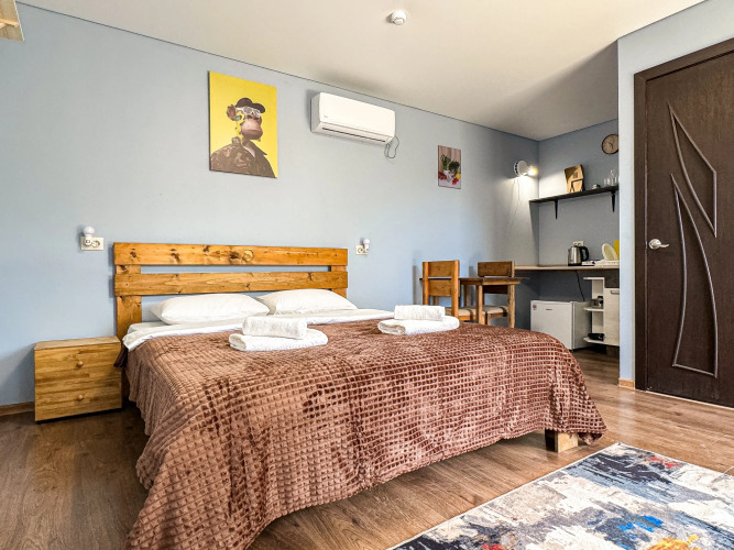 Номера отеля представляют собой студии, которые имеют отдельный вход, санузел и кухню. В кухне есть необходимое для приготовления пищи, в том числе электроплита, чайник, холодильник. Студии предназначены для проживания двух гостей.