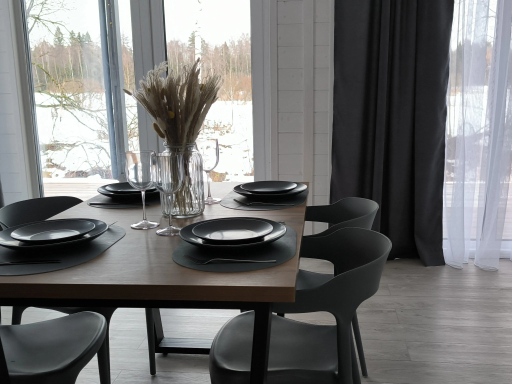 Кухня-гостиная включает в себя: микроволновую печь, индукционную плиту, посудомоечную машину, холодильник и измельчитель пищевых отходов. Есть необходимая посуда на четверых человек. Воду можно пить из-под крана, установлена система водоочистки.