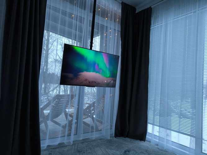 Есть диван, раскладной обеденный стол, Smart TV с выходом в интернет, Wi-Fi, кондиционер.