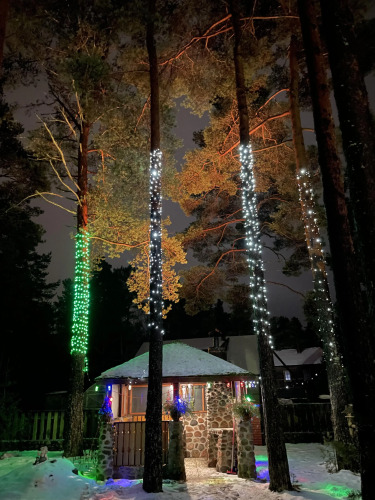 Обустроенная территория: по периметру имеется забор, ландшафтный дизайн, оснащенность парковкой. К услугам гостей баня в отдельном сооружении. Услуга платная. Во всех домах установлен телевизор с плоским экраном и спутниковыми каналами, имеется камин, интернет. В распоряжении гостей собственная ванная комната с тапочками и внутренний дворик. В кухни вся посуда и бытовая техника, гостиная зона с диваном оборудована в виде паба с барной стойкой и игрой в кикер. Детская комната оформлена в сказочном стиле, есть игрушки и книги. В числе прочих удобств крытая беседка для приготовления пищи на огне, территория освещена. Рядом со зданием апартаментов обустроена детская игровая площадка, спортивный турник, гамак. Гости апартаментов «Уютный домик в сосновом лесу» могут сыграть в настольный теннис, а также заняться рыбной ловлей, лыжным спортом в близлежащем районе. Имеется оборудованный пляж даже для самых маленьких гостей, продовольственный магазин. Для апартаментов второго этажа прилагается балкон, библиотека и видеотека, проигрыватель. Важная информация: эти апартаменты не предназначены для детей младше 10 лет по технике безопасности.