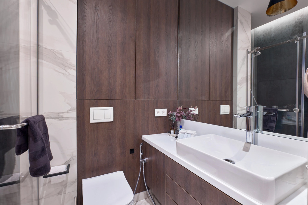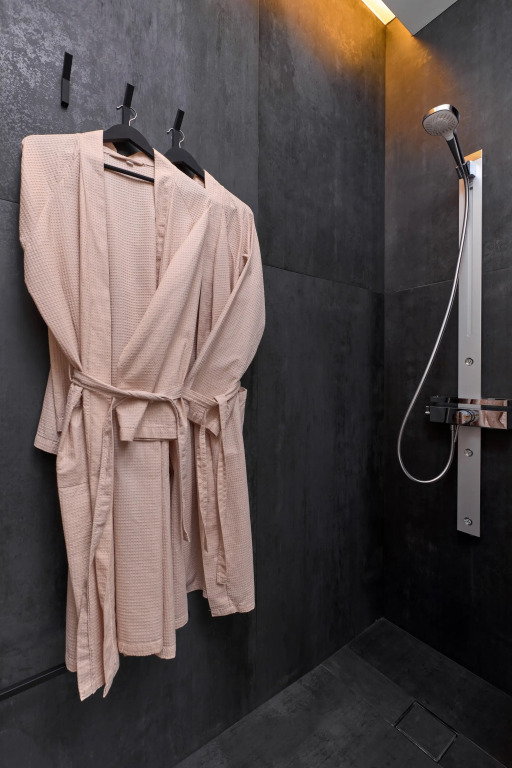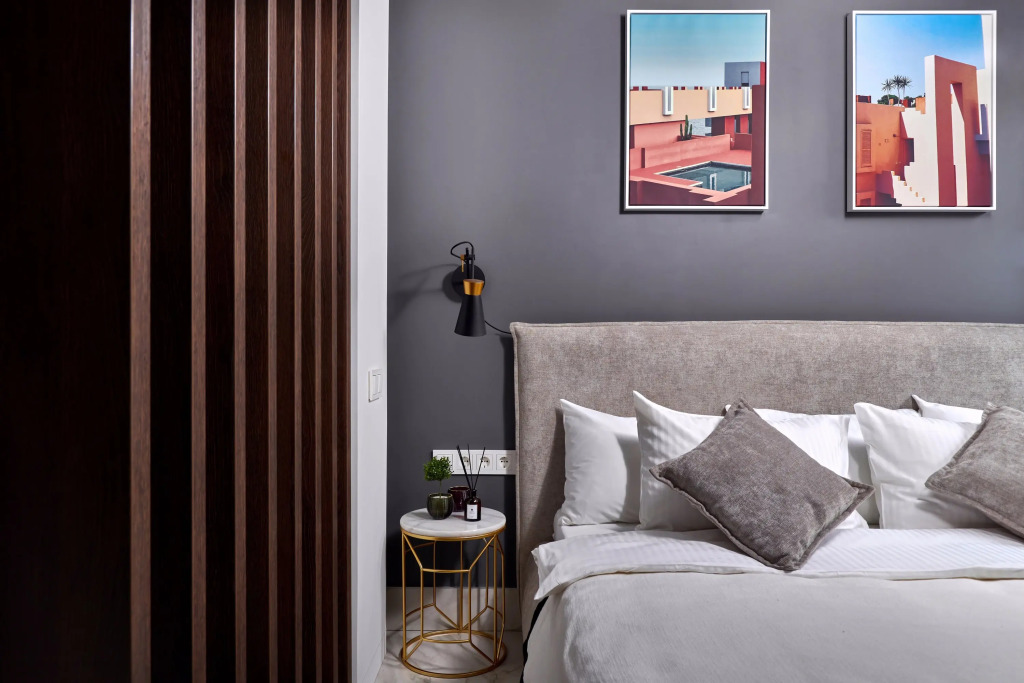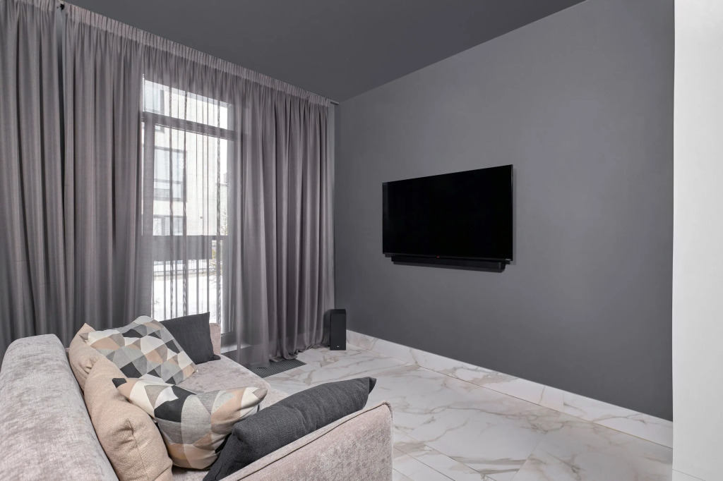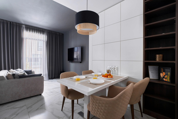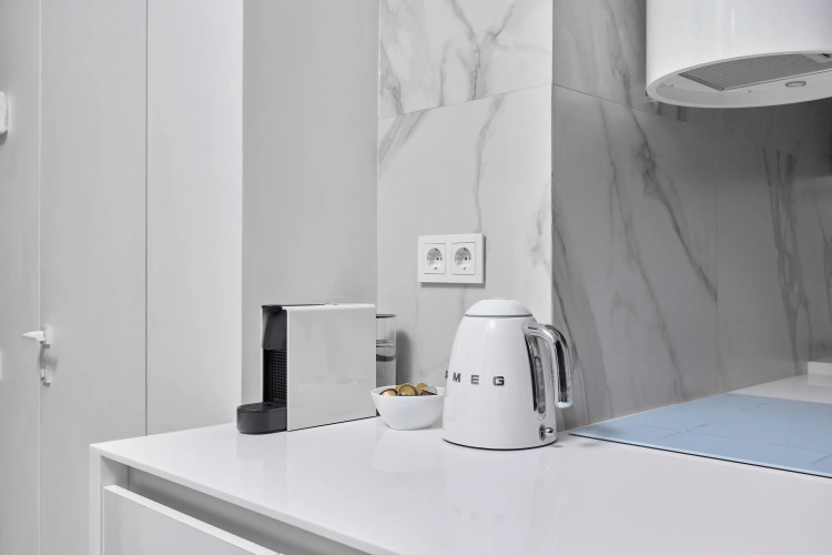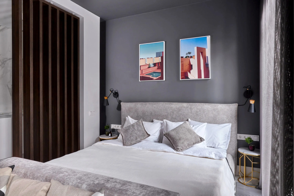 В апартаментах 4 спальных места: двуспальная кровать, раскладной диван. В распоряжении гостей оборудованная зона кухни с посудомоечной машинкой, варочной панелью, бытовой техникой, а также телевизор с объёмным звуком и специальное освещение зоны спальни. Душевая также имеет несколько режимов освещения.