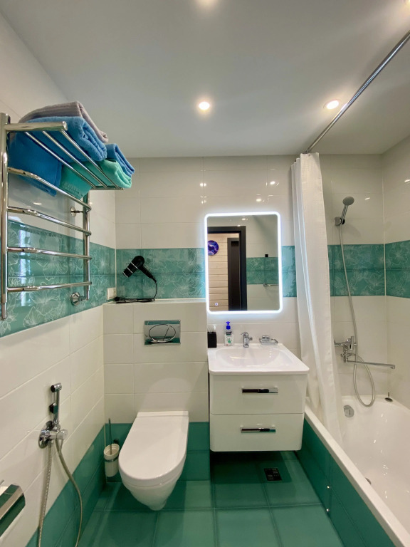 На первом этаже находится санузел с душевой кабиной и выходом в сауну. На втором этаже — санузел с ванной.