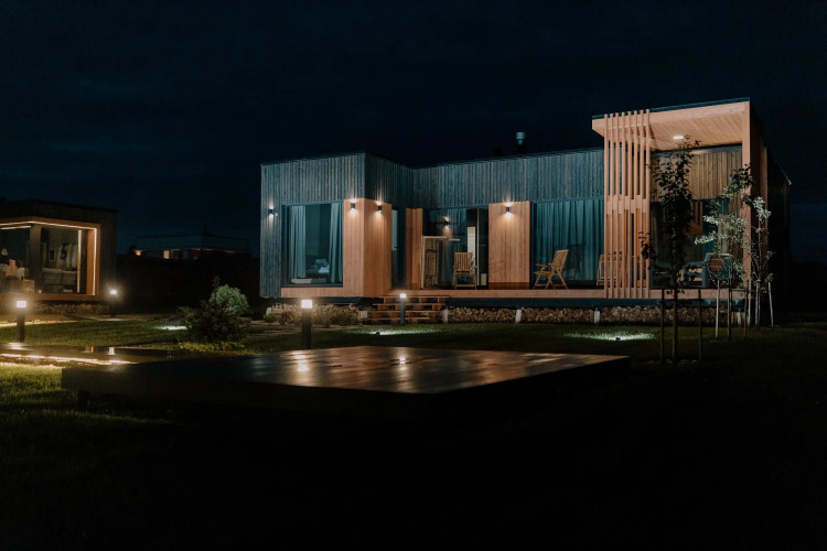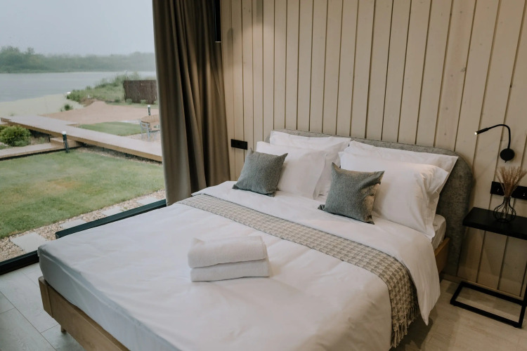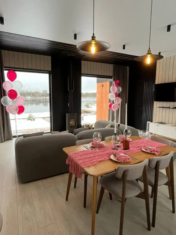 На территории есть парковка, ландшафтный дизайн, вечерняя подсветка дома и территории, пирс, корзина для пикника, собственная береговая линия и песчаный пляж с шезлонгами, сапы для прогулок по озеру, костровая зона с грилем для барбекю. В доме есть кухня-гостиная с обеденной зоной, оборудованная бытовой техникой. Диванная зона в гостиной с панорамными окнами, в наличии камин. Ванная комната с косметическим наборами и феном. Терраса с деревянной уличной мебелью.
