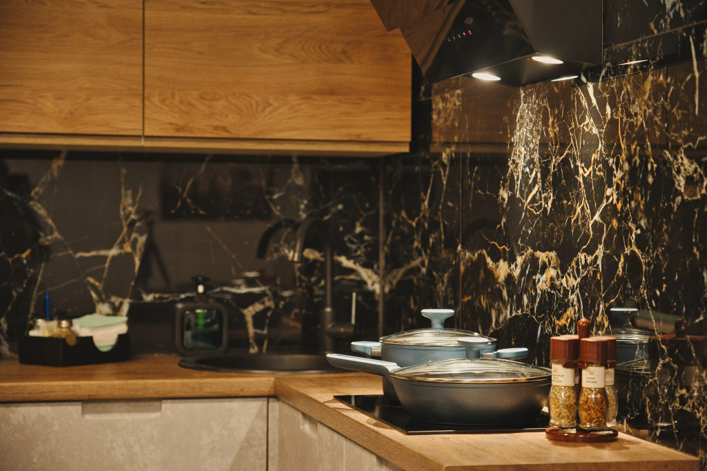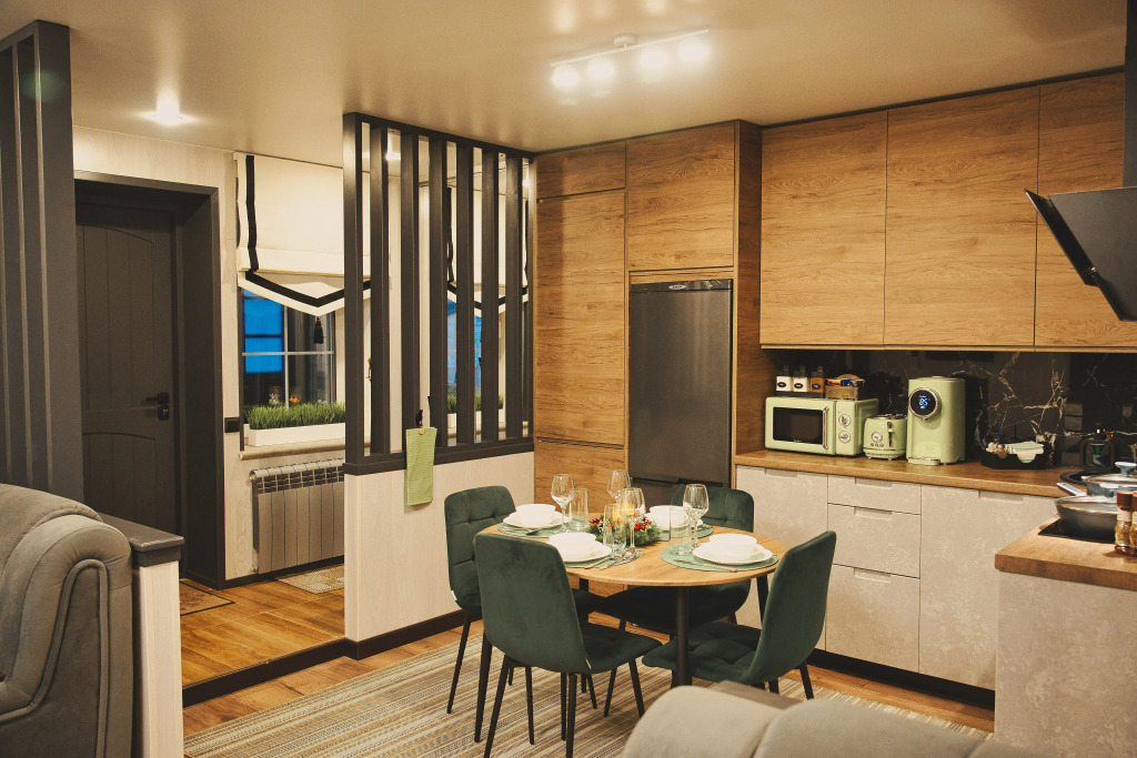 На кухне предусмотрены посудомоечная машина, варочная панель, вытяжка, холодильник, микроволновая печь, термопот, тостер, современная посуда, бокалы и необходимая утварь. Для удобства гостей предлагаются чай, кофе, сахар и соль. За отдельную плату предусмотрен мини-бар.