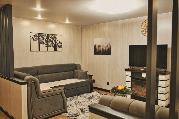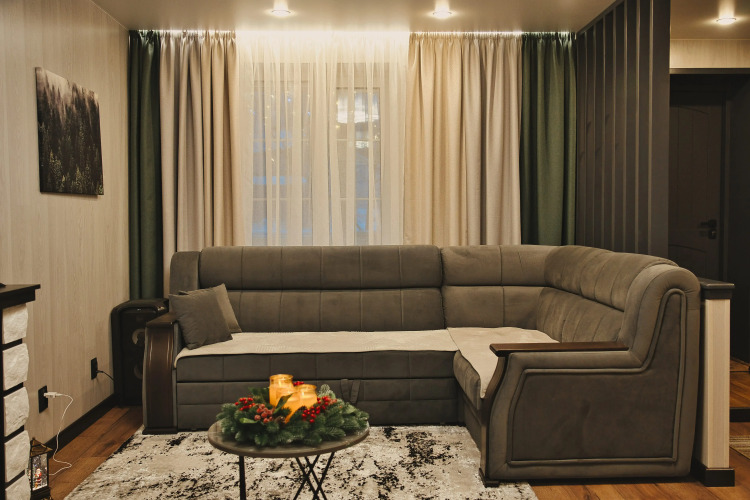 Парковка организована во дворе дома. У апартаментов отдельный вход со двора. В гостиной установлены два угловых раскладных дивана, двуспальная кровать с ортопедическим матрасом, а также комоды, прикроватные тумбочки и зеркальный шкаф. К услугам гостей два телевизора с диагоналями 50 и 43 дюйма, голосовой помощник, музыкальная колонка, камин и высокоскоростной Wi-Fi.