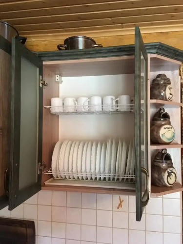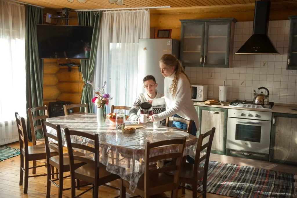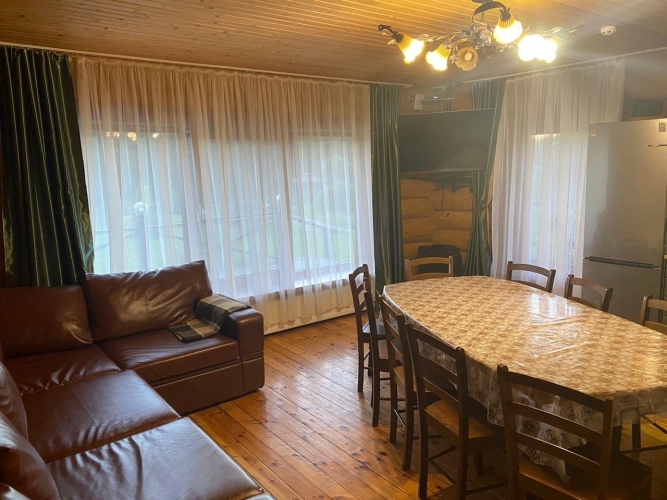 На первом этаже дома кухня-гостиная с угловым раскладным диваном, большой стол, стулья, спутниковое ТВ, высокоскоростной Wi-Fi, караоке, музыкальный центр, есть детский стульчик для кормления ребенка. Кухонная зона полностью оборудована: холодильник, газовая плита, СВЧ печь, чайник, посудомоечная машина, духовой шкаф, соковыжималка, вся необходимая посуда для приготовления и сервировки блюд. Специально оборудован детский уголок с игрушками и тёплым полом. В распоряжении гостей 2 спальные комнаты с двуспальными кроватями, в одной из спален детская кроватка.