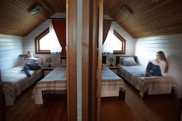 Лестница на второй этаж оборудована защитой от свободного доступа маленьких детей. На втором этаже имеется большой холл с аэрохоккеем и раскладным диваном, 2 спальни, в каждой по 2 полутороспальные кровати, санузел. Два дополнительных спальных места — это евро-раскладушки.
