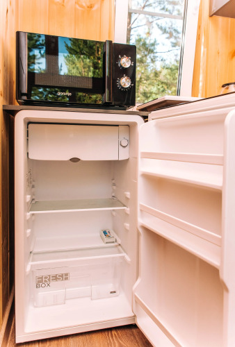 Кухонная зона с микроволновой печью, холодильником, индукционной плитой и посудой. Есть тарелки, бокалы, фужеры, заварочник, кастрюля, сковородка, а также чай, кофе, сахар, соль, масло, макароны, мука и прочее.