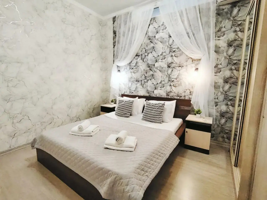 Апартаменты находятся на цокольном этаже. В помещении есть небольшие окна.